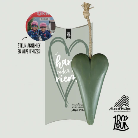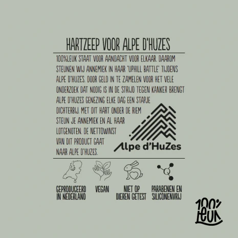 100% leuk staat voor aandacht voor elkaar. Daarom steunen wij Annemiek in haar ‘uphill battle’ tijdens Alpe d’Huzes. Door geld in te zamelen voor het vele onderzoek dat nodig is in de strijd tegen kanker, brengt Alpe d’Huzes genezing elke dag een stapje dichterbij. Met dit hart onder de riem steun je Annemiek en al haar lotgenoten. De nettowinst van dit product gaat naar Alpe d’Huzes.
