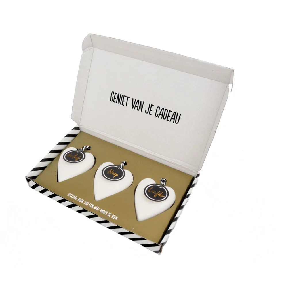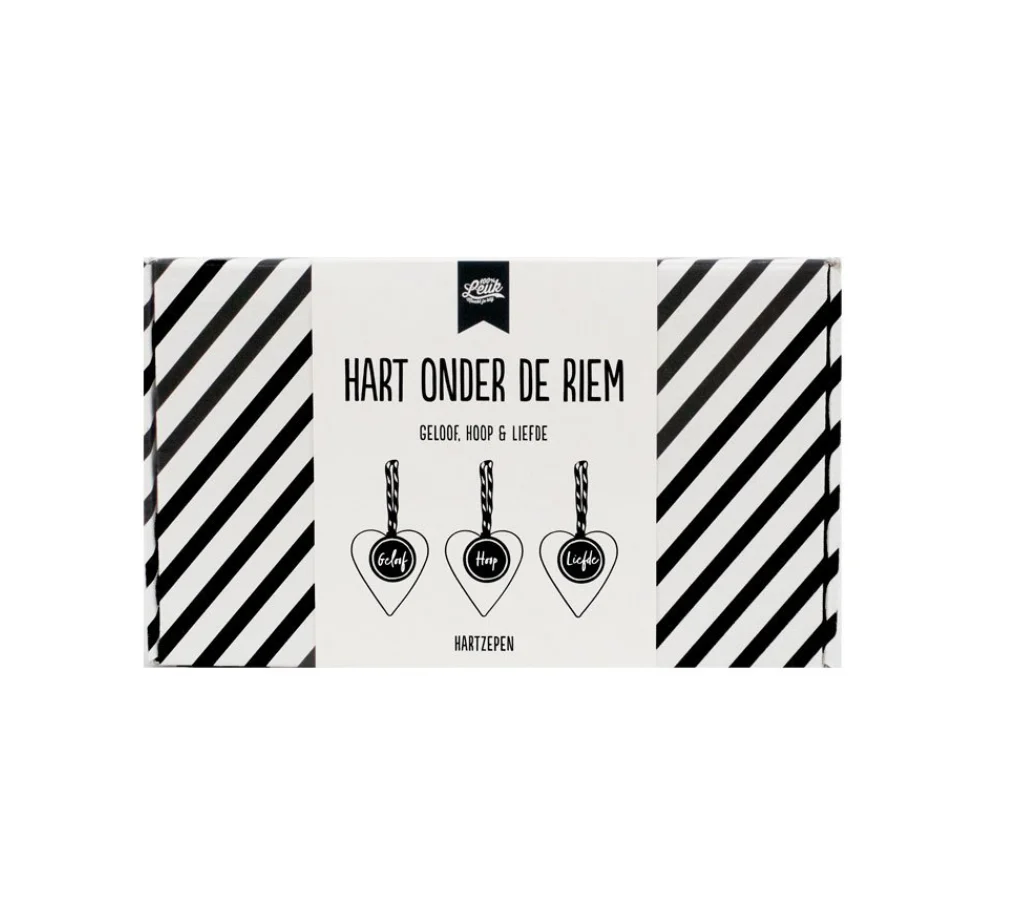 Dit cadeau is er in 2 varianten in het wit met zeepjes geloof, hoop & liefde en in het zwart met sterkte, kracht & knuffel.