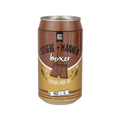 Met dit mannencadeau kom je niet met lege handen aan op de verjaardag van je broer of vader. Ook als bedankje naar je vriend of je zwager is dit een 100% leuk cadeau! Een stoer bierblikje gevuld met een boxer, gemaakt van bamboevezels. Het bovenste deel van het blikje is afneembaar, zodat je bij de boxer kunt komen. De boxer is zijdezacht en bovendien milieuvriendelijk. Bamboe heeft namelijk weinig water nodig en pesticiden zijn overbodig. Deze boxer is verkrijgbaar in de meest gangbare maat: L-XL.