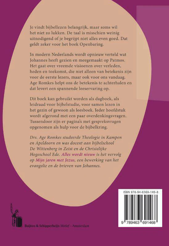 Je vindt bijbellezen belangrijk, maar soms wil het niet zo lukken. De taal is misschien weinig uitnodigend of je begrijpt niet alles even goed. Dat geldt zeker voor het boek Openbaring. In modern Nederlands wordt opnieuw verteld wat Johannes heeft gezien en meegemaakt op Patmos. Het gaat over vreemde visioenen over verleden, heden en toekomst, die niet alleen van betekenis zijn voor de eerste lezers, maar ook voor ons vandaag. Age Romkes helpt ons de betekenis te achterhalen en dat levert een spannende leeservaring op. Dit boek kan gebruikt worden als dagboek, als leidraad voor bijbelstudie, voor samen lezen in het gezin of gewoon als leesboek. Ieder hoofdstuk wordt afgerond met een paar overdenkingsvragen. Tussendoor zijn er pagina’s met gespreksvragen opgenomen als hulp voor de bijbelkring. Drs. Age Romkes studeerde Theologie in Kampen en Apeldoorn en was docent aan bijbelschool De Wittenberg in Zeist en de Christelijke Hogeschool Ede. Alles wordt nieuw is het vervolg op Mijn jaren met Jezus, een bewerking van het evangelie en de brieven van Johannes