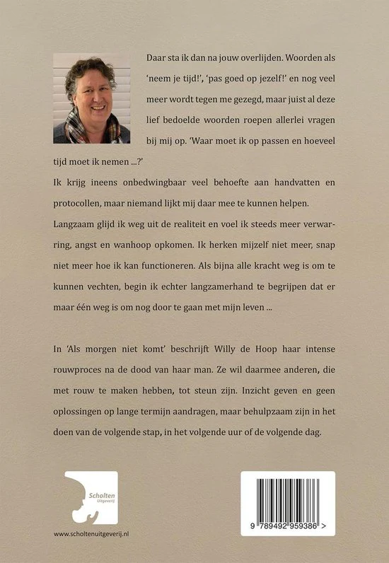 Daar sta ik dan na jouw overlijden. ‘Neem je tijd!’, ‘pas goed op jezelf!’ en nog veel meer wordt tegen me gezegd, maar juist al deze lief bedoelde woorden roepen allerlei vragen bij mij op. ‘Waar moet ik op passen en hoeveel tijd moet ik nemen …?’ Ik krijg ineens onbedwingbaar veel behoefte aan handvatten en protocollen, maar niemand lijkt mij daar mee te kunnen helpen. Langzaam voel ik steeds meer verwarring, angst en wanhoop opkomen. Ik herken mijzelf niet meer, snap niet meer hoe ik kan functioneren. Steeds meer verlies ik de realiteit uit het oog, maar als bijna alle kracht weg is om te kunnen vechten, begin ik langzamerhand te begrijpen dat er maar één weg is om nog door te gaan met mijn leven … Willy de Hoop beschrijft haar intense rouwproces na de dood van haar man. Ze wil daarmee anderen die met rouw te maken hebben, tot steun zijn. Inzicht geven en behulpzaam zijn in het doen van de volgende stap, in het volgende uur of de volgende dag.