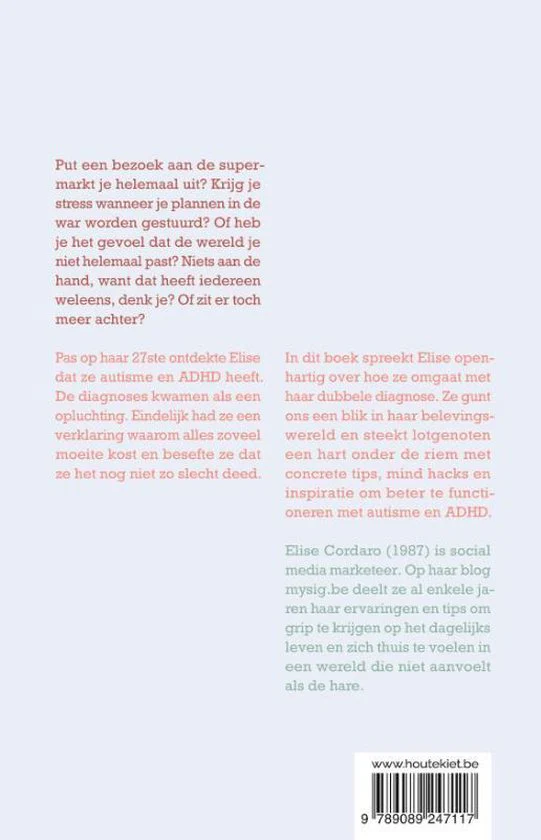 In dit boek spreekt Elise openhartig over hoe ze omgaat met haar dubbele diagnose. Ze gunt ons een blik in haar belevingswereld en steekt lotgenoten een hart onder de riem met concrete tips, mind hacks en inspiratie om beter te functioneren met autisme en ADHD.