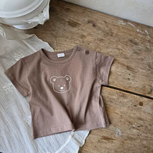 Bruin T-shirt met korte mouwen. Oversized model, breed en kort. Schattige opdruk met het hoofdje van een teddybeer. Leuk voor baby jongens maar kan ook als unisex.
