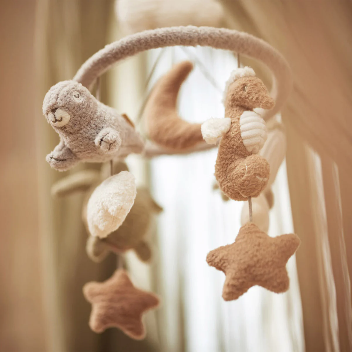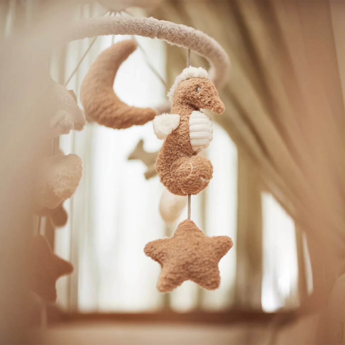 Laat je kleintje de wondere wereld van de oceaan ontdekken met onze Deep Sea mobielhanger. Deze betoverende hanger is perfect om boven de box te hangen en je baby te laten genieten van een zee van avonturen. Aan de mobiel hangen schattige oceaandiertjes, zoals een walvis, een schildpad en een zeepaard, verrijkt met speelse schelpjes, sterren en maantjes. De verschillende stoffen, waaronder zacht teddy in de kleuren biscuit, olive green en oatmeal, zorgen voor een heerlijke zintuiglijke ervaring. Breng de diepe zee rechtstreeks naar de babykamer en laat je kleintje zich verwonderen over de onderwaterwereld met deze prachtige mobielhanger. Hang de mobiel gemakkelijk op aan een (houten) mobiel arm (niet meegeleverd).
