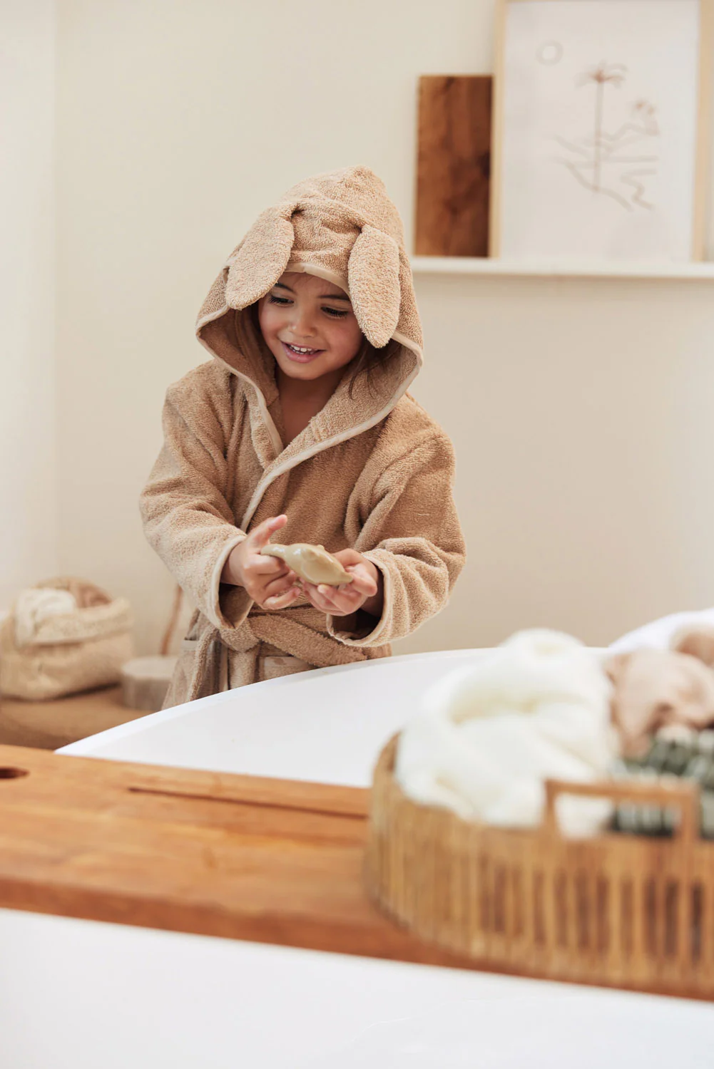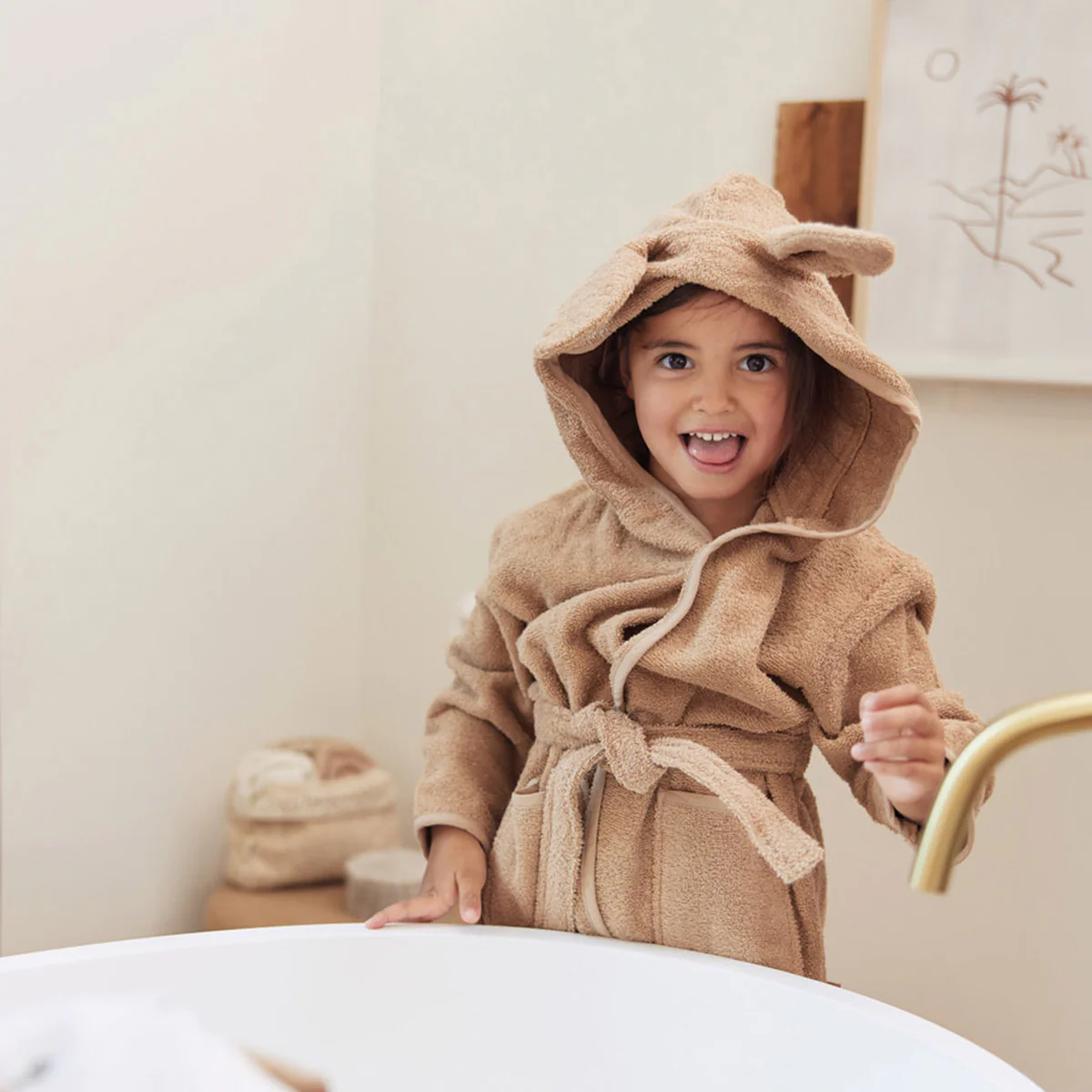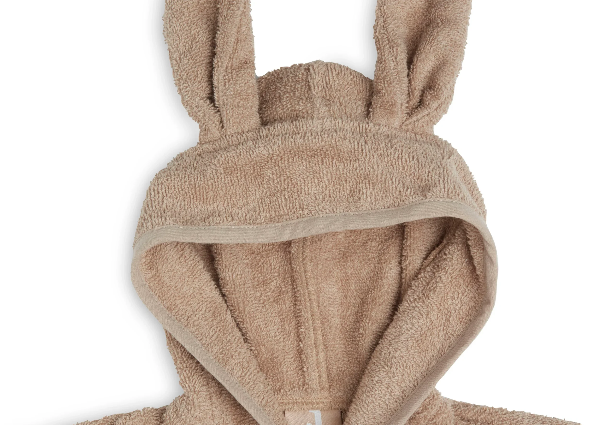 Tover jouw kleintje om in een schoon knuffel konijntje na een bad of douche sessie. Deze leuke badjas met konijnenoren heeft de kleur biscuit. Biscuit is een zacht bruine, camelkleurige kleurtint. Badjas Bunny biscuit is gemaakt van badstof.