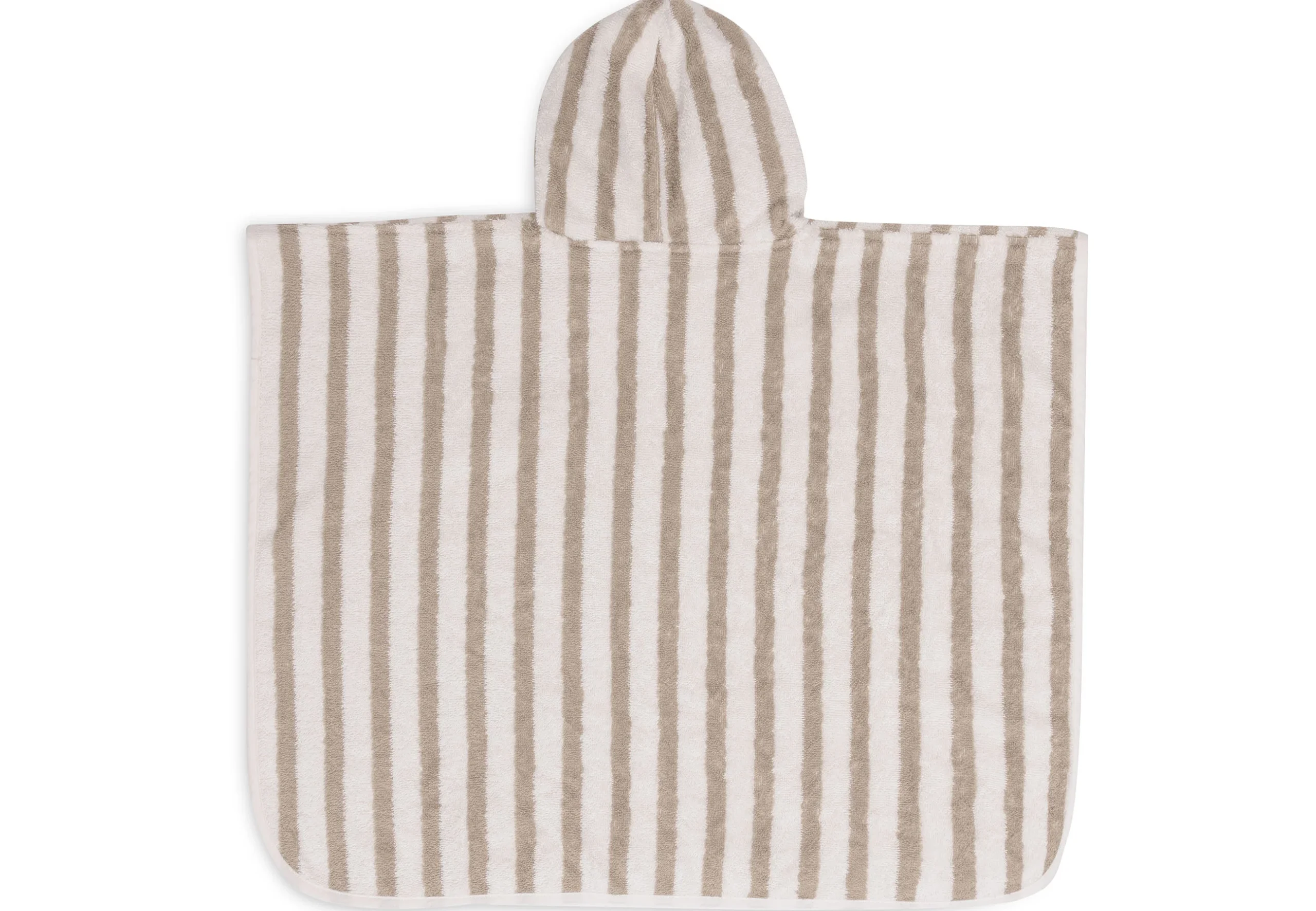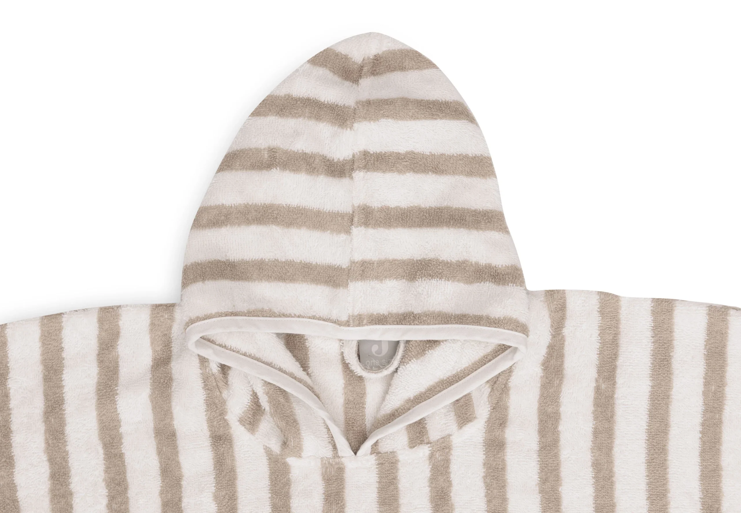 De olijfgroene badponcho met strepen is 60cm lang en 63cm breed.
