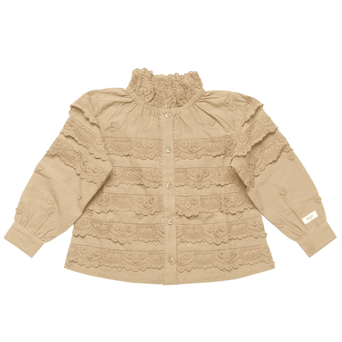 Oh wauw, deze blouse Luen van Baje Studio is echt alles wat je hebben wil deze winter voor je meisje. Prachtige details, zoals een mooi opstaande kraag en kanten ruches en embroderie hartjes.