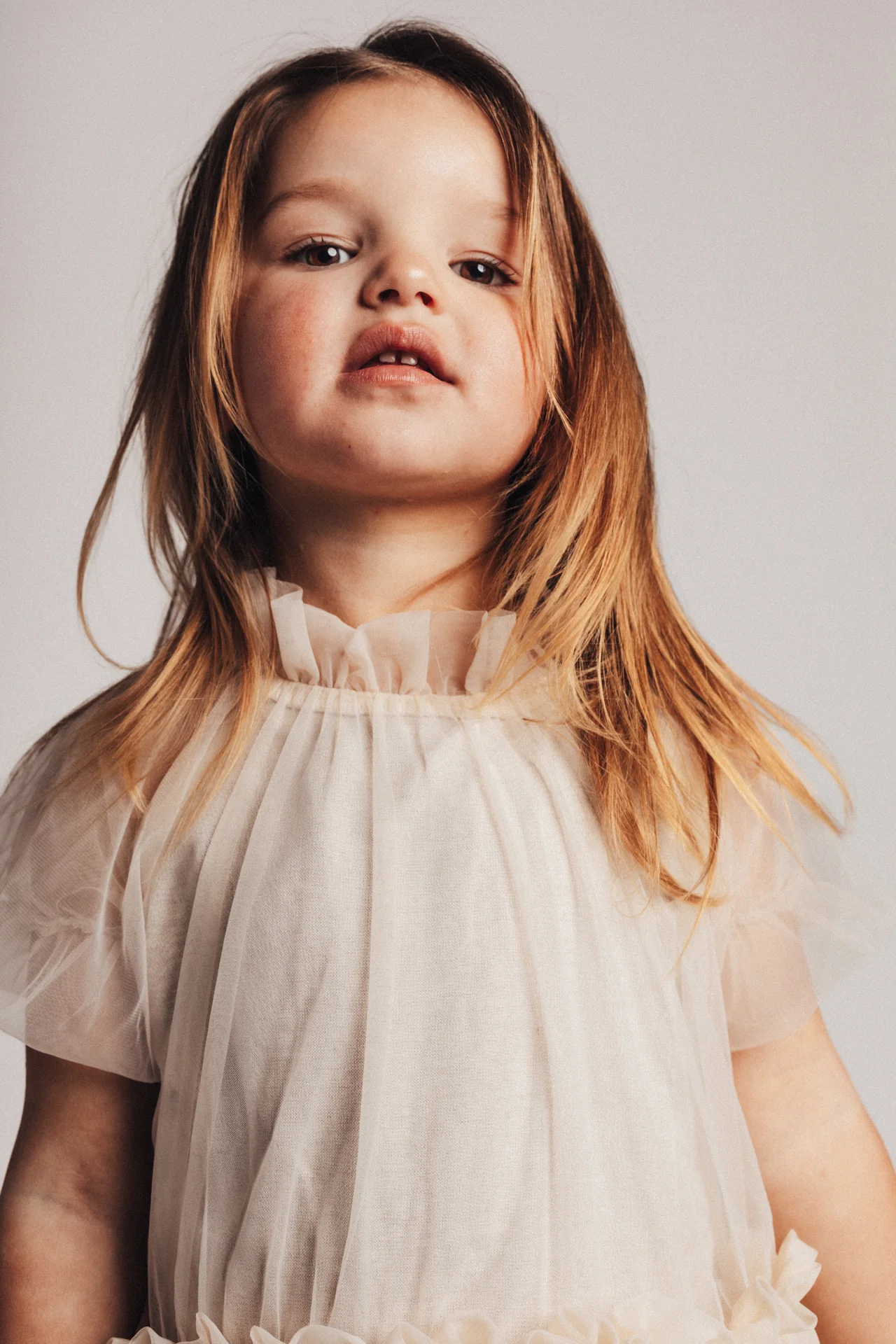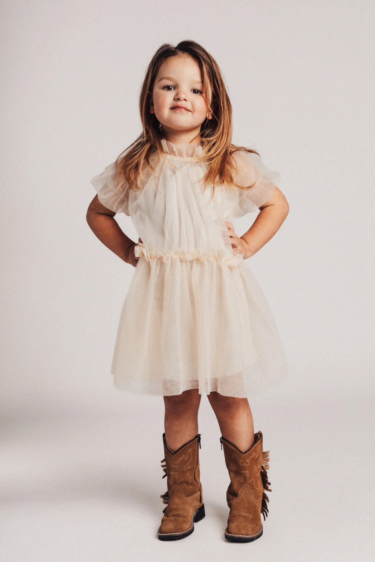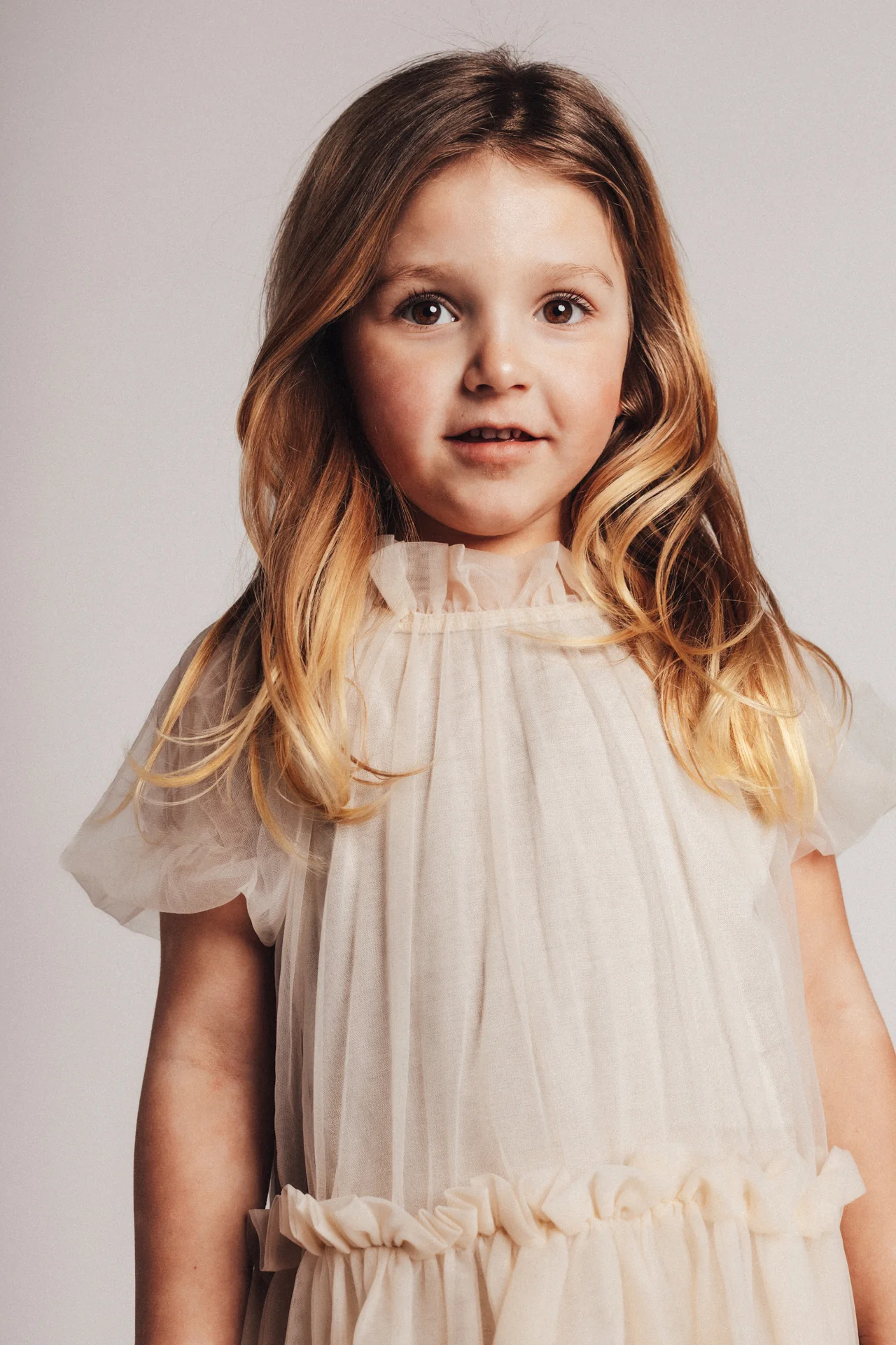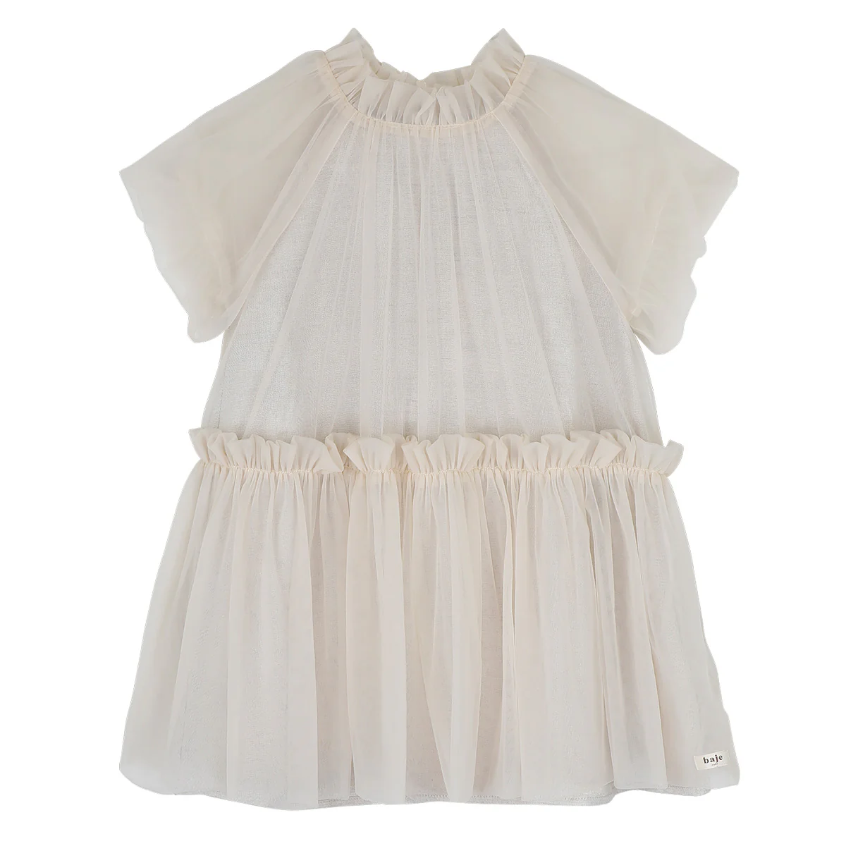 Tule party dress Melle van Baje Studio heeft een onderjurk, met uitzondering van de mouwen. Valt soepel en zwierig. Door de neutrale beige tule kan je veel kanten op met deze jurk. Feestelijk, maar zeker niet too much.