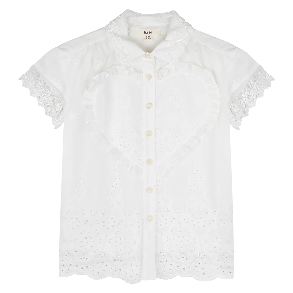 Zomerjurk met hart detail van baje studio. Zowel de kraag als de mouwen en de onderkant van jurk Lous hebben broderie details. Het opvallende hart op het voorpant maakt de jurk erg uniek en speels. De jurk valt ongeveer tot op de knie.