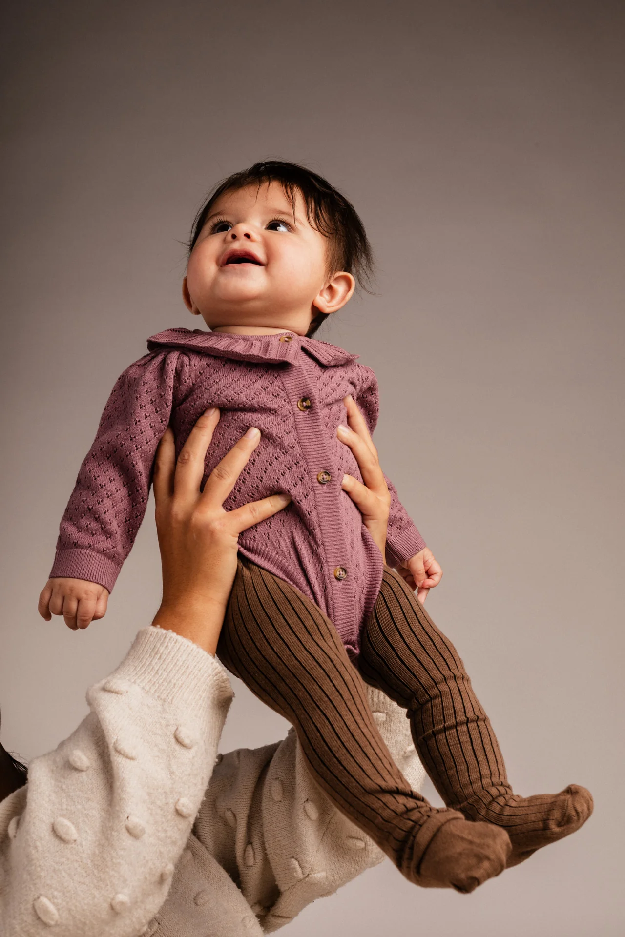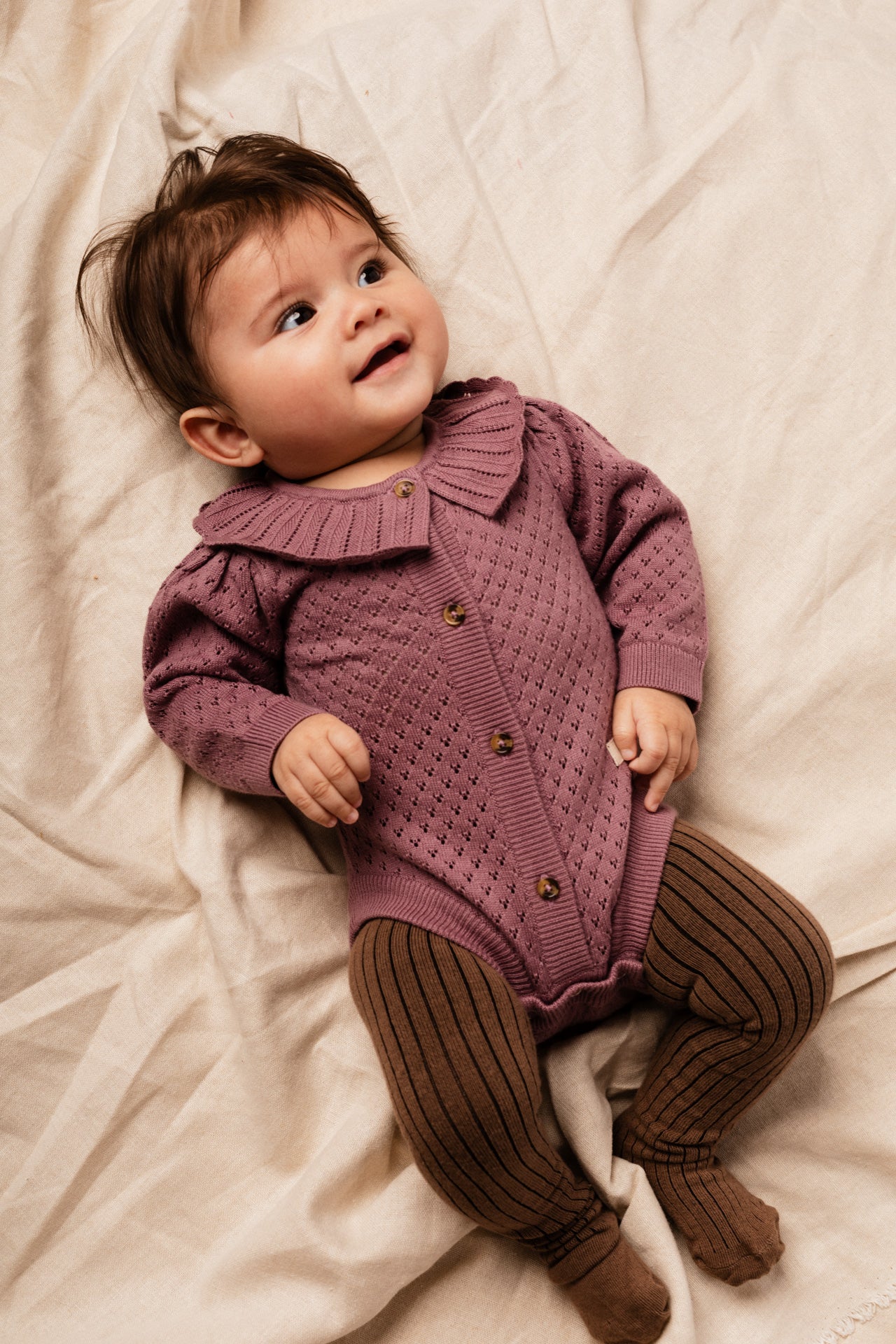 Hele mooie winterse kleur romper voor baby meisjes. Bodysuit Chardonne van Baje Studio is gebreid en heeft een mooie kraag. Heeft een houten knoop sluiting over de gehele lengte en drukknoop sluiting aan de onderkant. Deze romper kan je mooi dragen met een maillot, bijvoorbeeld een bruine tint zoals op de foto’s.