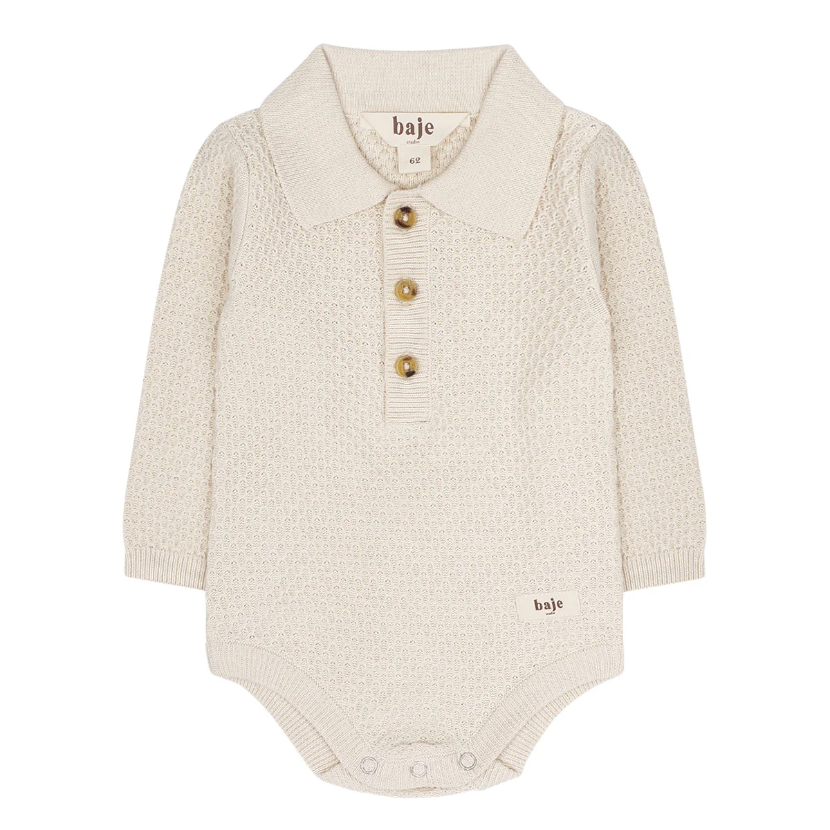 Prachtige gebreide polo romper met lange mouwen. Bodysuit Zalain van Baje Studio heeft een neutrale offwhite kleur. De must have voor elke baby jongen!