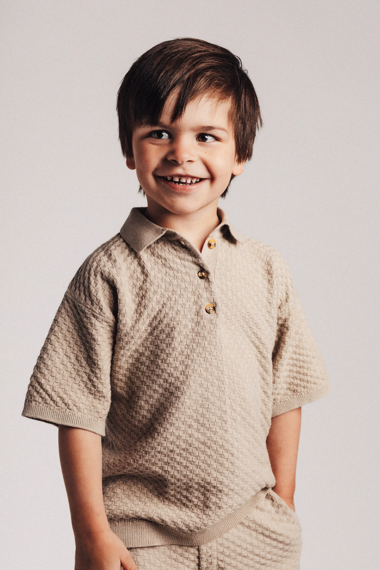 Gebreide polo voor jongens in taupe kleur. De polo is gebreid in een square knit. Prachtige look en comfortabel om te dragen. De kleur taupe gray is een vergrijsde taupe tint.
