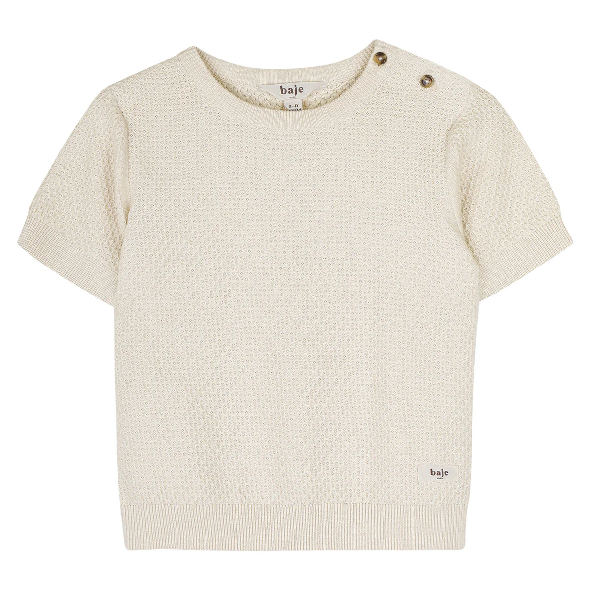 Prachtig gebreid shirt met korte mouwen voor jongens. Shortsleeve Frain heeft structuur in het breisel. De kleur white coconut is een offwhite tint. Knitted shortsleeve Frain is zowel in baby, peuter als kindermaten beschikbaar. In zowel de kleine als de grote maten heeft het gebreide shirt houten knoopjes op de schouder.