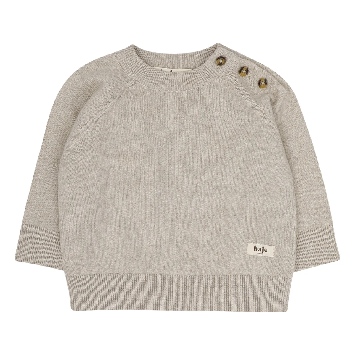 Gebreide rui van Baje Studio in de kleur taupe cafe. Beschikbaar voor baby’s, peuters en kinderen. Taupe cafe is een koele taupe tint. Sweater Oto heeft knoopsluiting bij de schouder zodat de trui makkelijk over het hoofdje van jouw baby/kind kan.