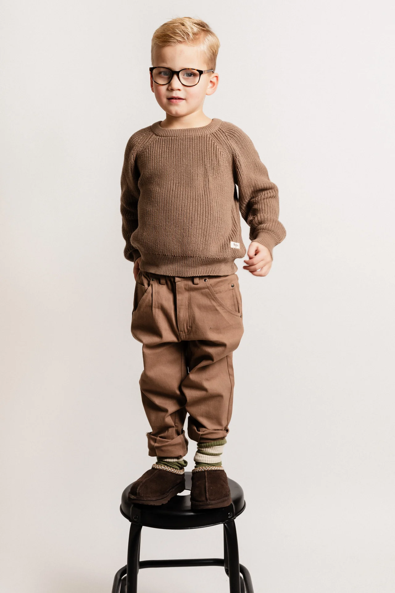Gebreide trui van biologisch katoen voor jongens/unisex. Knitted sweater Thun van Baje Studio is een prachtige basic trui van hoge kwaliteit. De kleur bruin is makkelijk combineerbaar. De trui draag leuk met een polo of overhemd eronder, maar is zonder ook erg mooi.