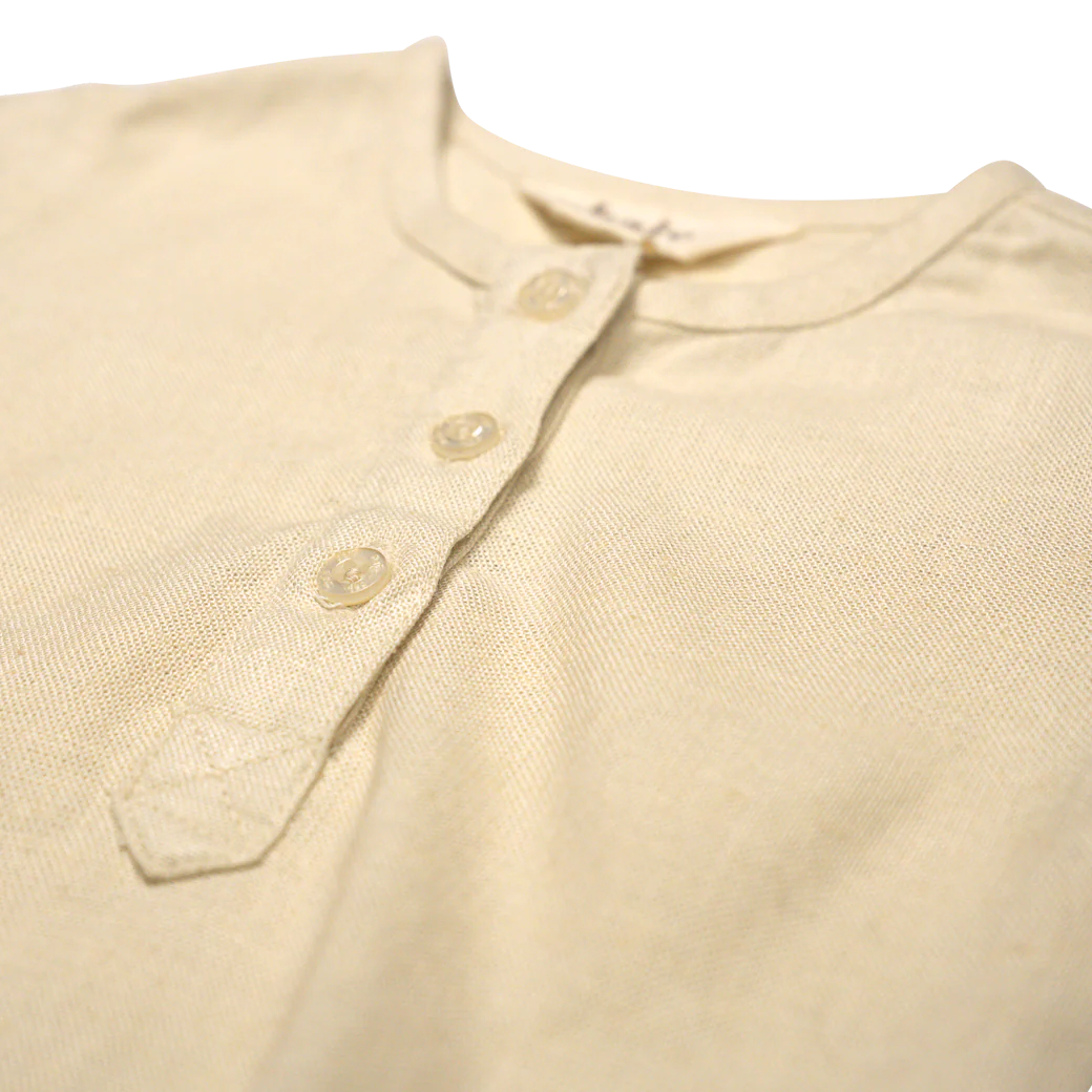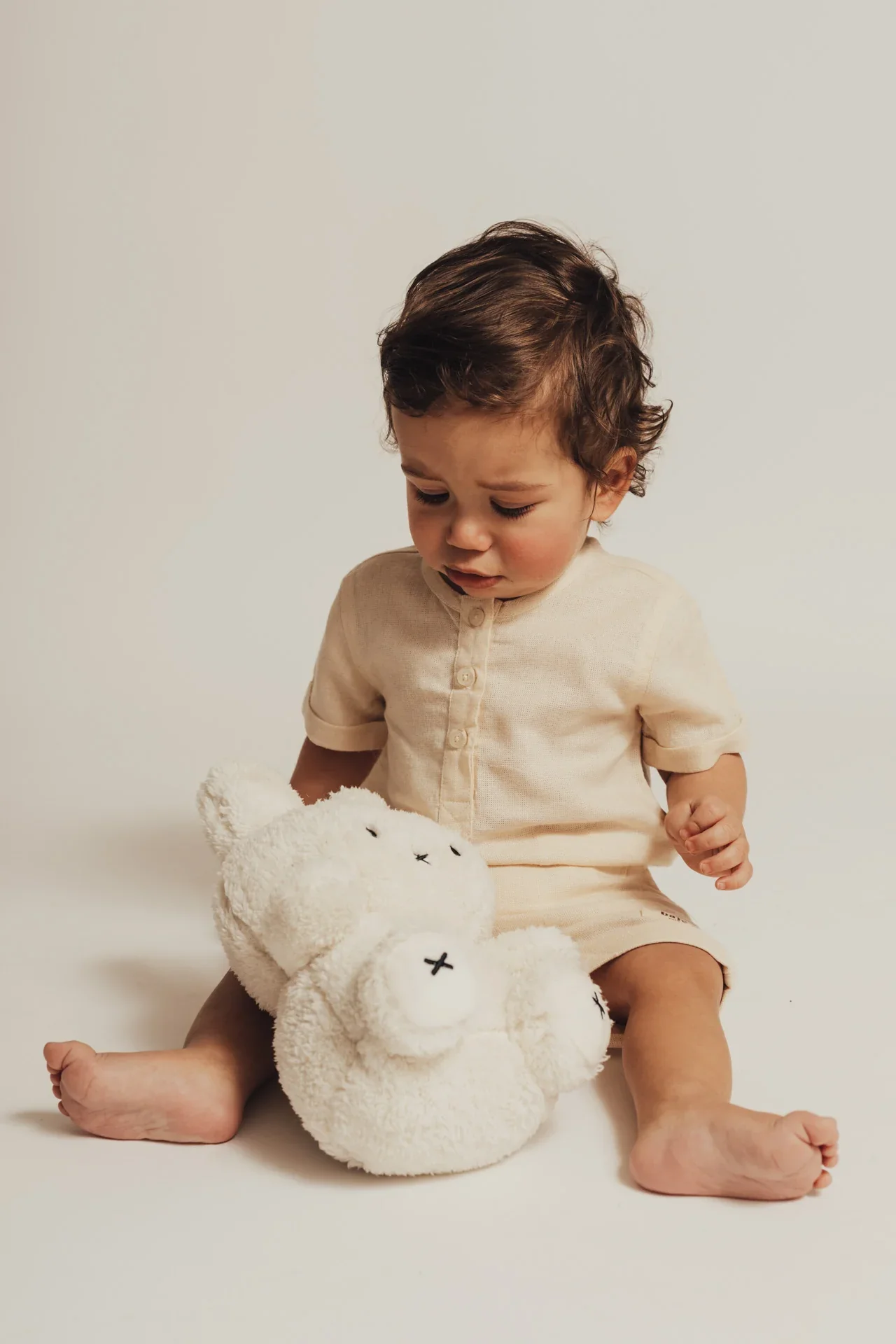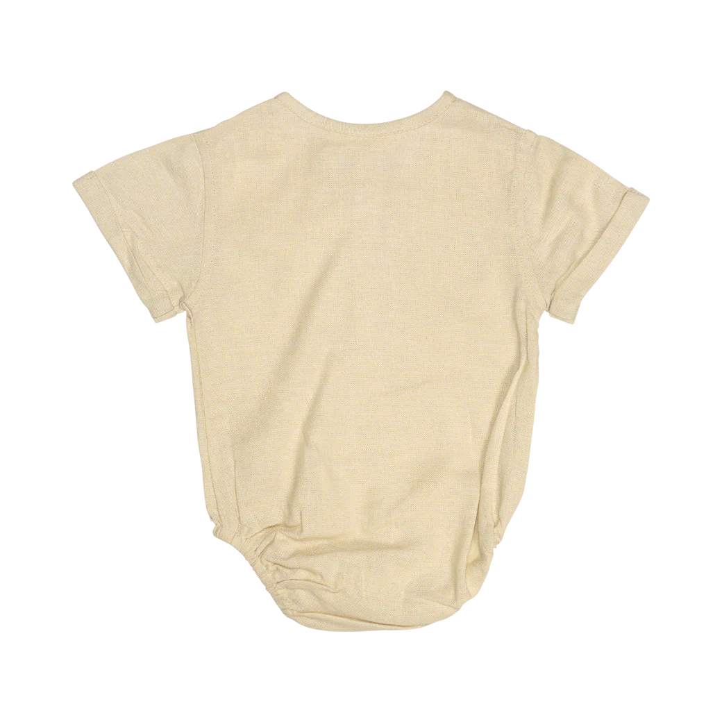 Dit mooie rompertje van Baje brengt een hoge dosis cuteness in de garderobe van je baby. Het linnen rompertje is comfortabel om te dragen en heeft drukknoopjes aan de onderkant, zodat je je baby makkelijker kunt aankleden/verschonen. Romper Hervey is verkrijgbaar in twee prachtige kleuren; zand en lichtblauw. Perfect voor de vele gelegenheden en gezellige dagen. Romper Hervey kan je leuk stijlen met shorts, of met knitwear (vest, truitje) op de koudere dagen.