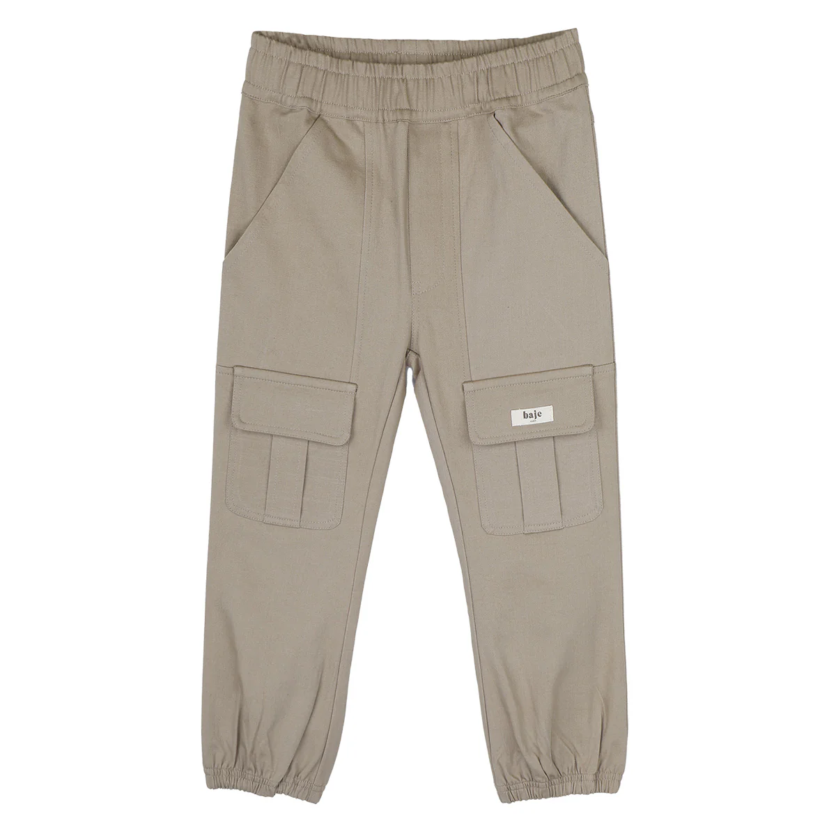 Stoere jongensbroek. Pants Piera van Baje Studio heeft stoere cargo zakken aan de voorkant. De broek heeft de kleur taupe cafe, dit een wat koelere taupe tint.