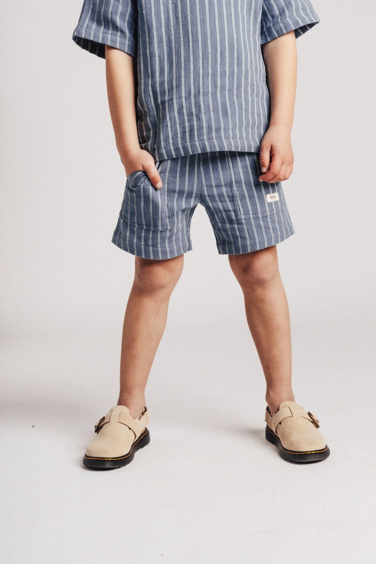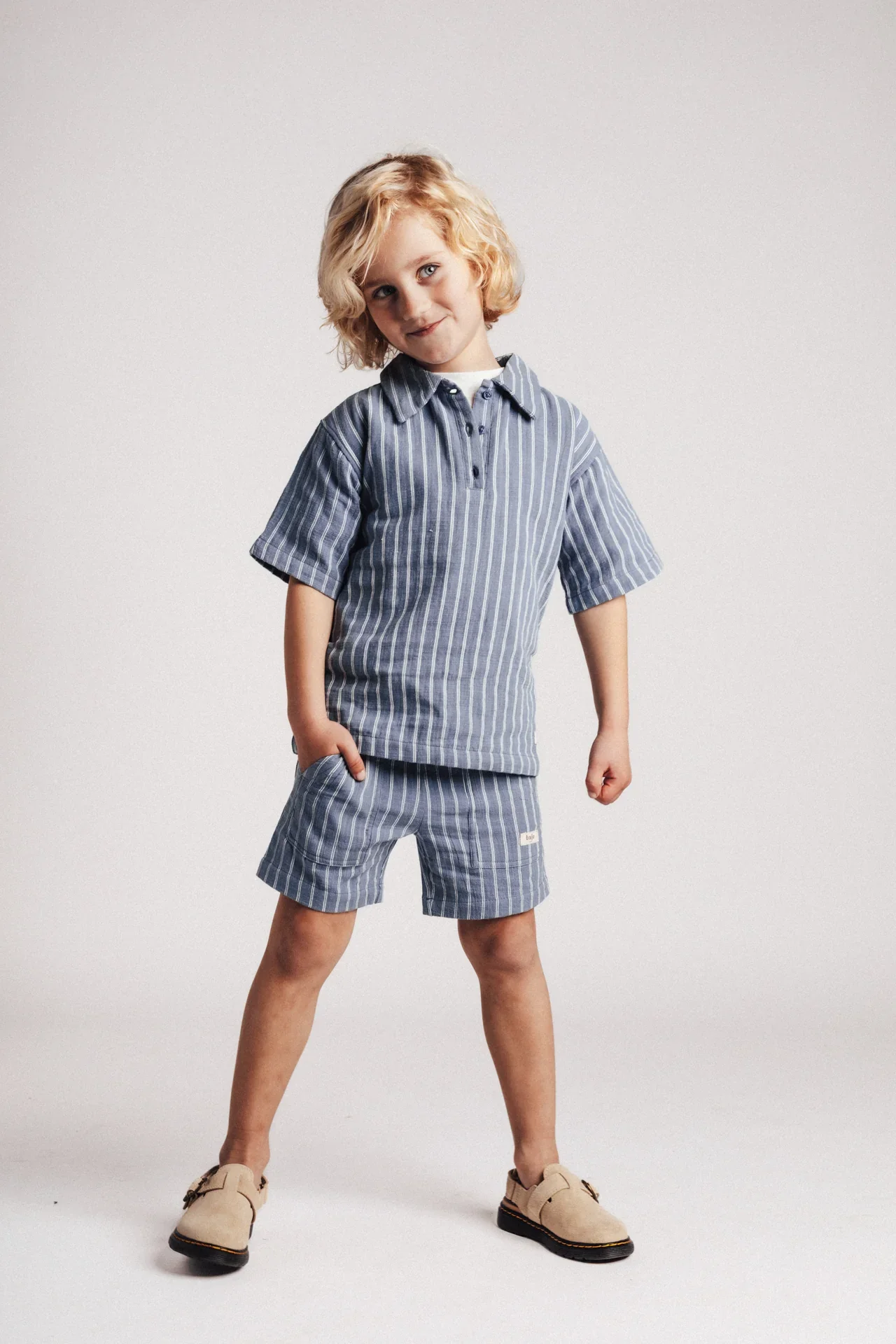 Korte broek voor jongens met krijtstrepen. Shorts Mathieu hebben een sportieve casual look. Je combineert de shorts tof met een (off)white top, maar je kan hem ook als co-ord set dragen met de bijpassende polo blouse Messo.