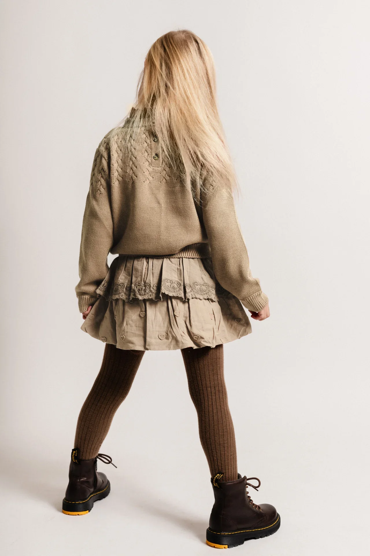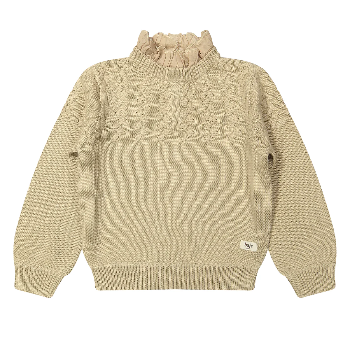Deze elegante meiden trui is een echte eyecatcher voor het najaar. Sweater Vallon van Baje Studi0 is gemaakt van een zachte katoenmix. De kindertrui heeft een speels gebreid patroon op het bovenstuk. De ruffle kraag in een lichte zand kleur geeft een romantische en speelse uitstraling. Aan de achterkant sluit de trui met knopen.