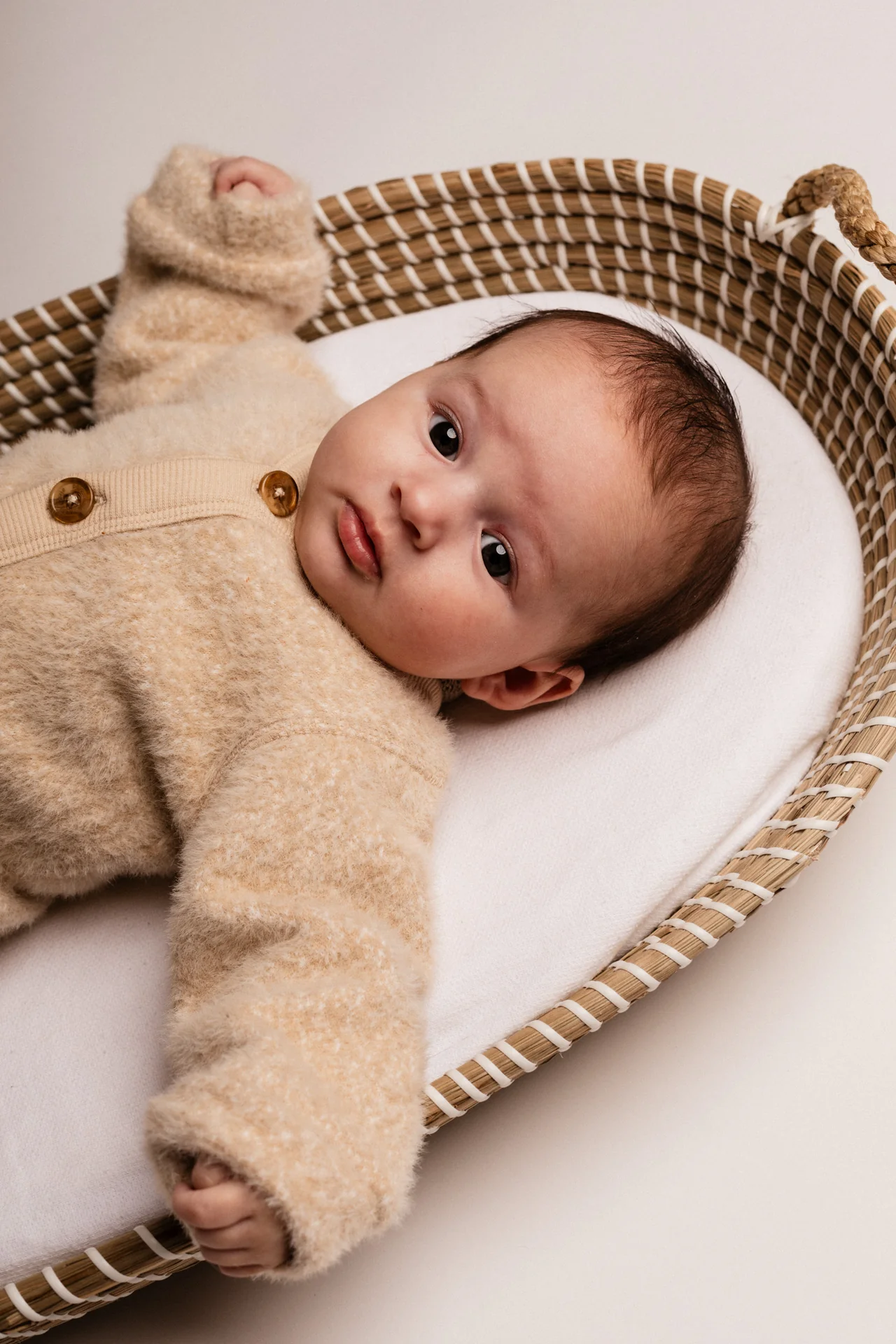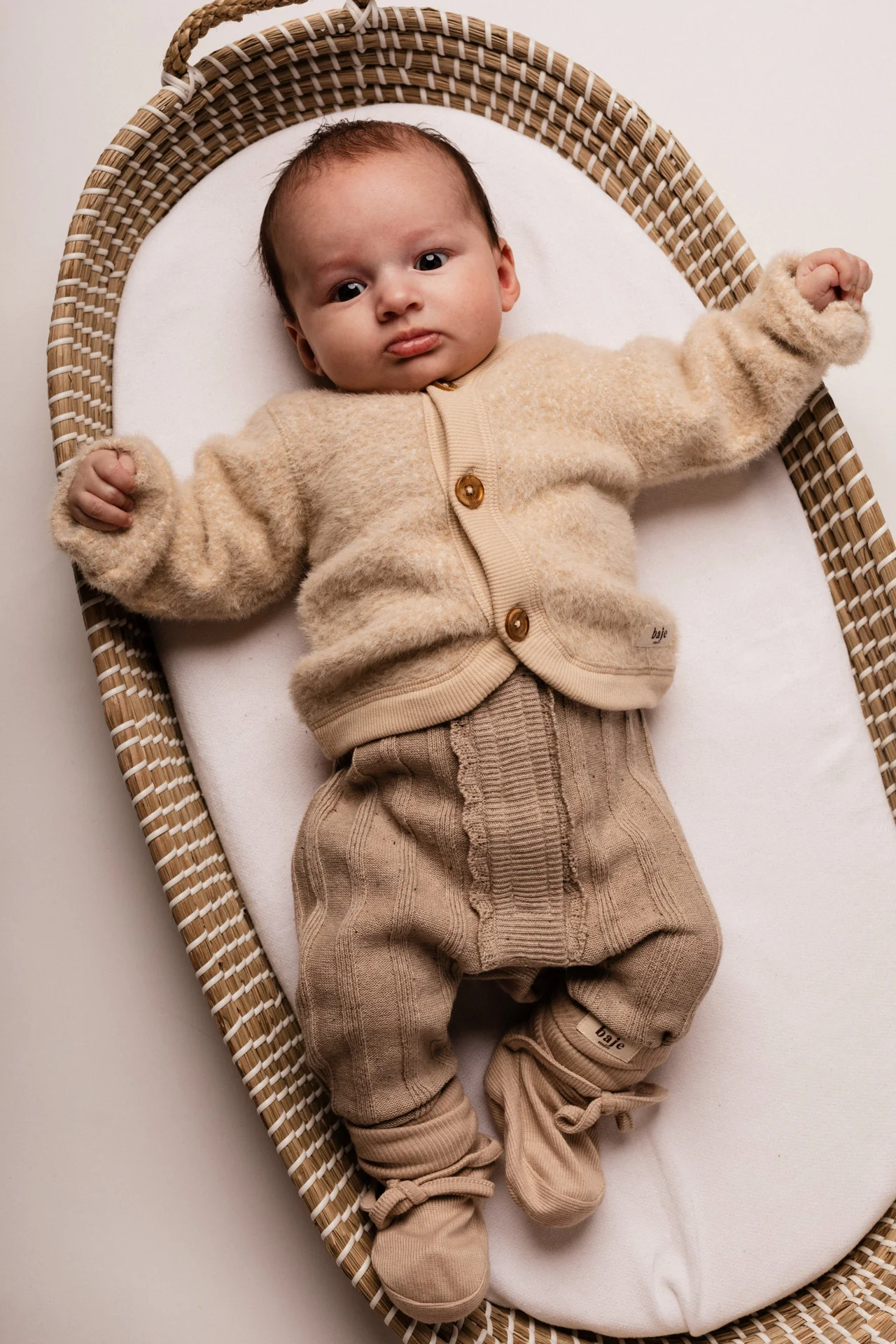 Kleur: de kleur sand desert is bij dit baby vestje meer een offwhite/crème tint.
