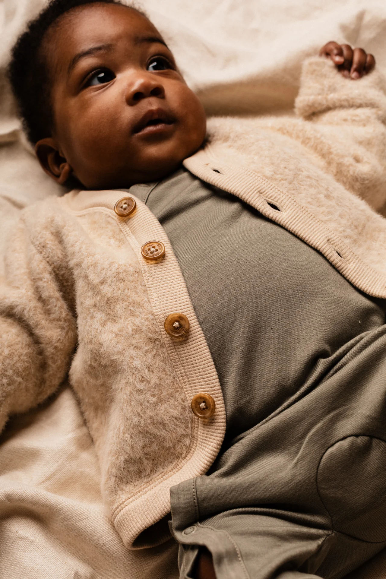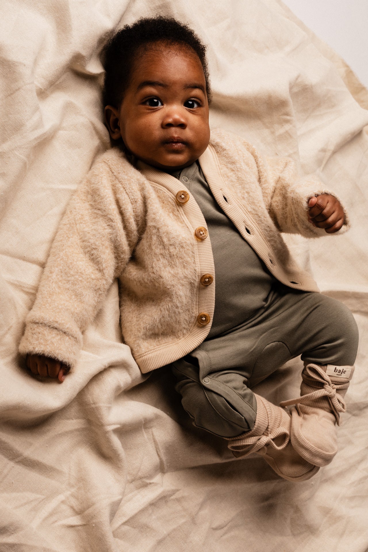 Schattig en warm wollen baby vestje van Baje Studio. Indoor jacket Fechy is heerlijk zacht en sluit middels knopen. Het baby vestje heeft corduroy boorden, dit zorgt voor mooie afwisseling in de stof. Dit vest is zowel leuk voor jongen als meisje. De kleur en het model van het vestje is makkelijk combineerbaar en maakt elk baby outfit compleet.