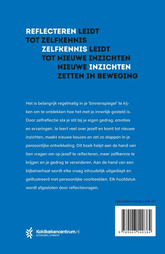 Binnenspiegel van Jan Pool en Michiel Santman is een uitnodigend boek dat lezers wil wijzen op de kracht en de waarde van zelfkennis en zelfreflectie. Het is belangrijk regelmatig in je ‘binnenspiegel’ te kijken om te ontdekken hoe het met je innerlijk gesteld is. Door zelfreflectie sta je stil bij je eigen gedrag, emoties en ervaringen. Zo leer je veel over jezelf en kom je tot nieuwe inzichten, maak je nieuwe keuzes en zet je zo stappen in je persoonlijke ontwikkeling. Dit boek helpt aan de hand van tien vragen om op jezelf te reflecteren, meer zelfkennis te krijgen en je gedrag te veranderen. Met behulp van een bijbelverhaal wordt elke vraag inhoudelijk uitgediept en geïllustreerd met persoonlijke voorbeelden. Elk hoofdstuk wordt afgesloten door reflectievragen.