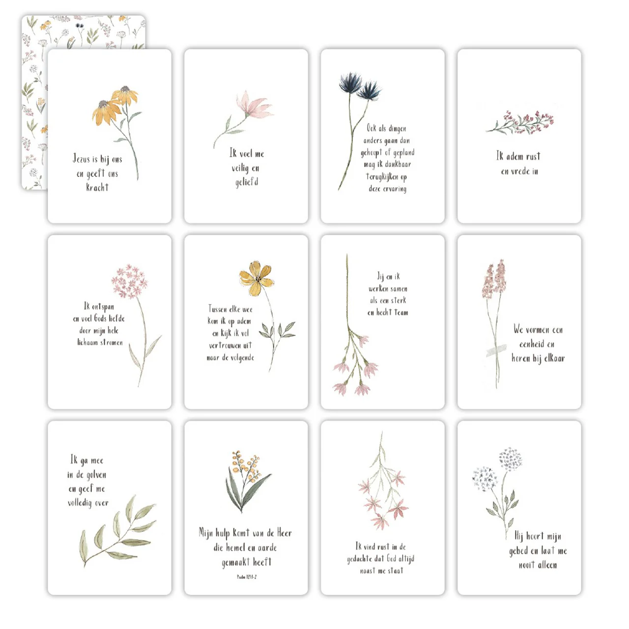 Set van 12 kaarten met bemoedigende teksten voor tijdens de zwangerschap en/of bij de geboorte van je kind. Mooi voor jezelf of om cadeau te doen.
