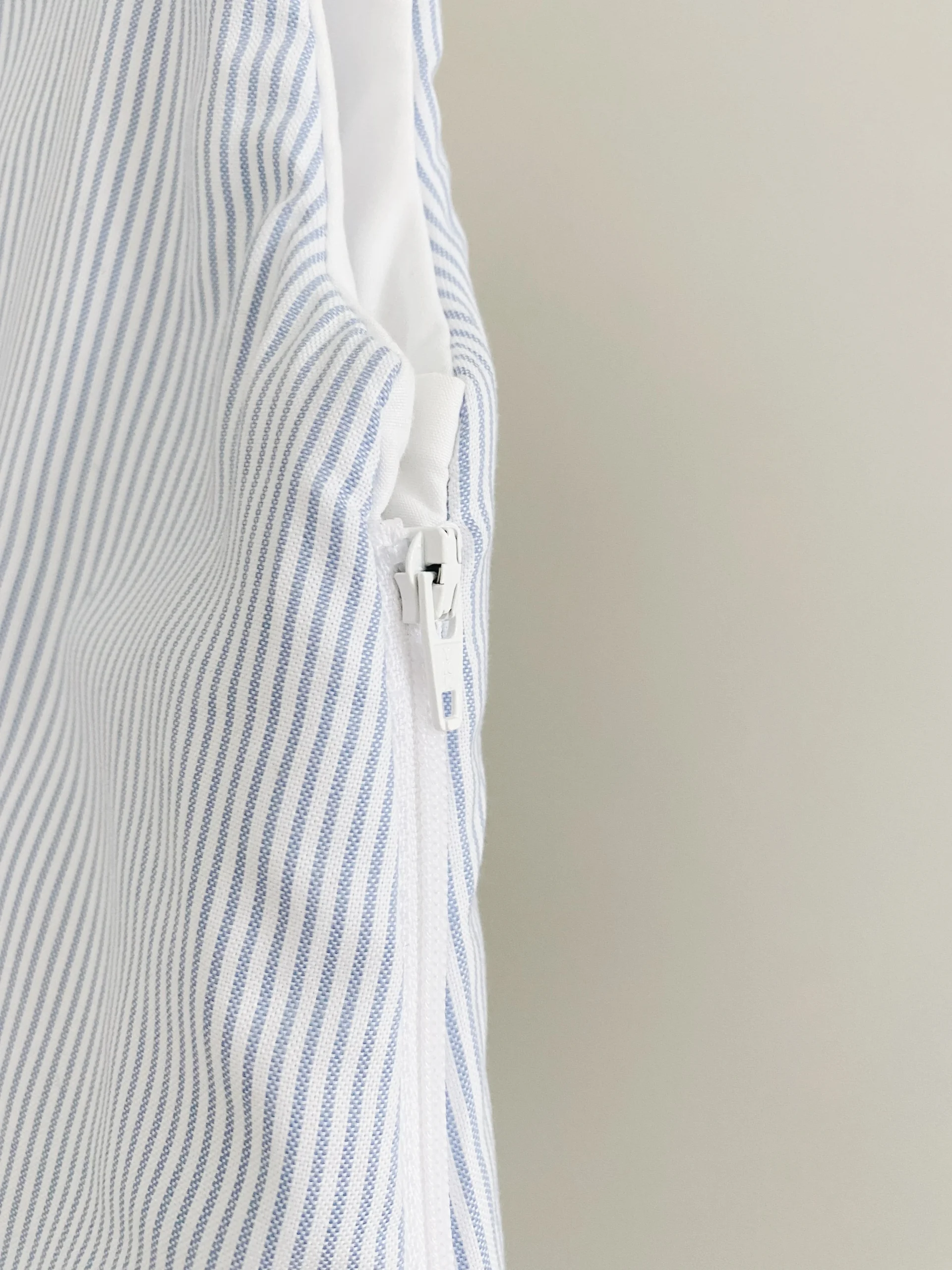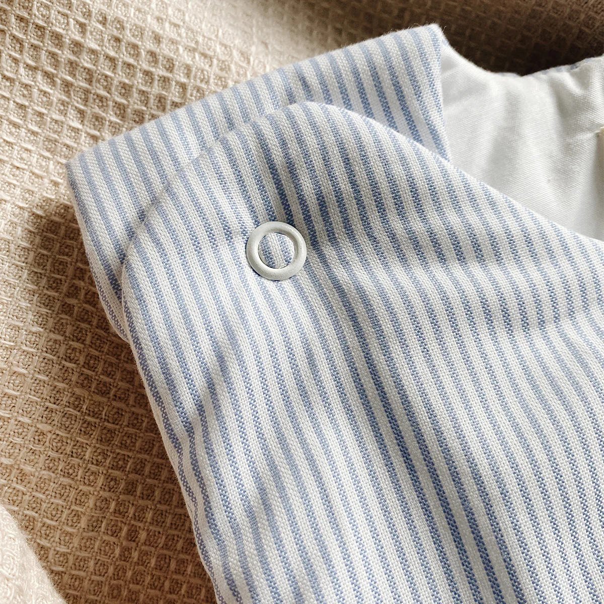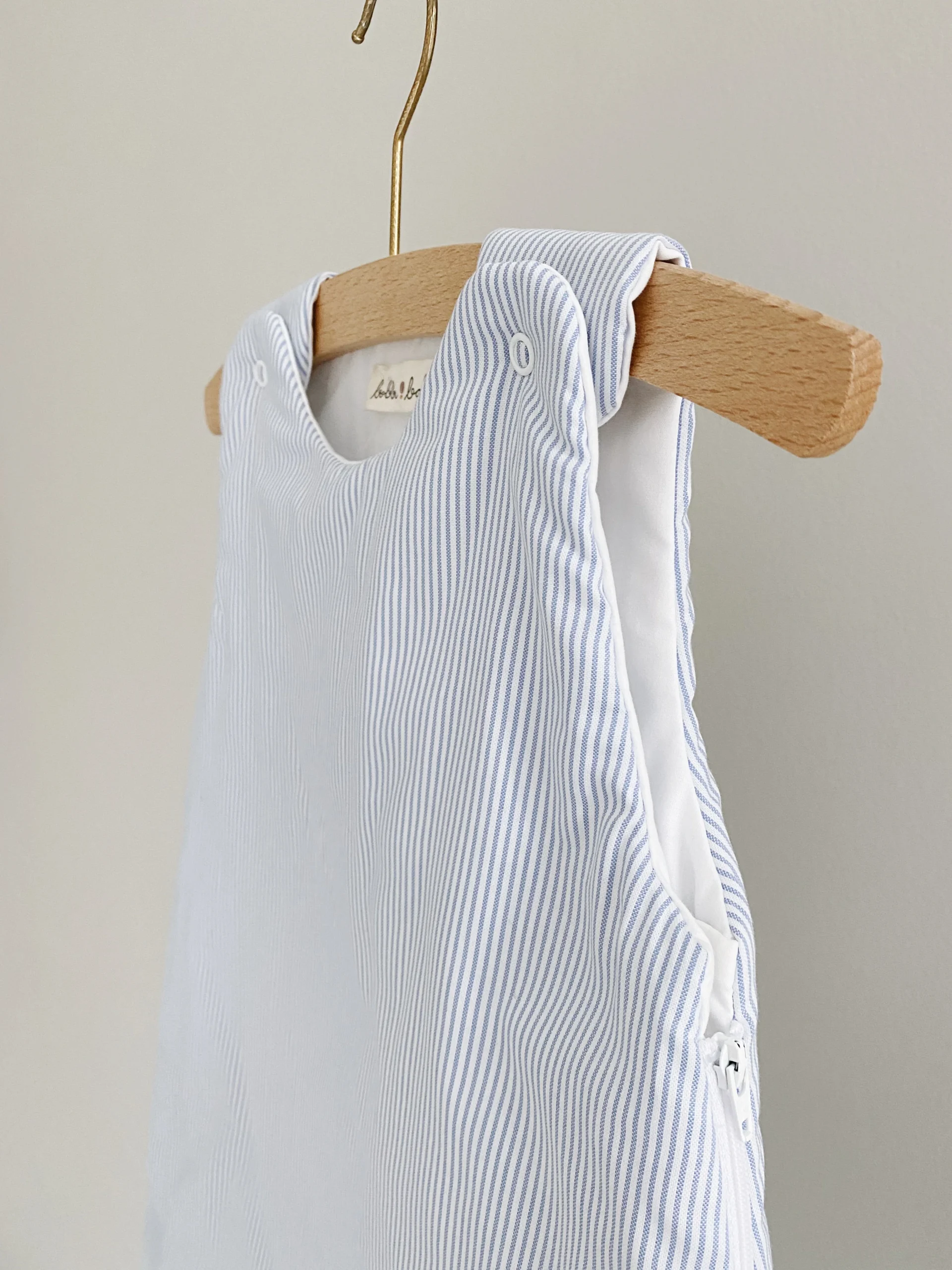 De lichtblauw gestreepte slaapzak is gemakkelijk te openen en te sluiten door middel van een ritssluiting (wit). De schouders hebben drukknoopejs, waardoor de slaapzak verstelbaar is en geschikt is voor iedere baby vanaf de geboorte.