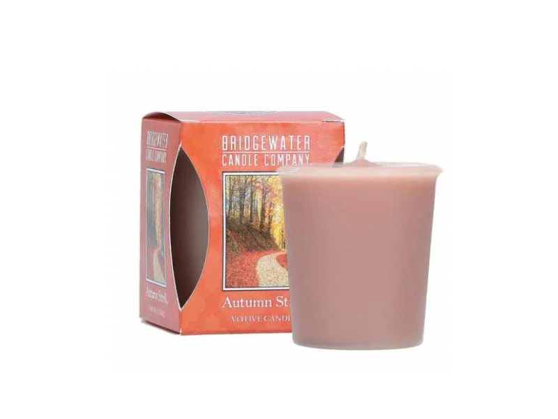 Bridgewater Votive /geurkaars Autumn Stroll. De Bridgewater Candle geurkaarsjes zijn gemaakt van natuurlijke soja, wat zorgt voor een lange en schone verbranding. De Bridgewater Candle geurkaarsjes hebben een brandduur van 15 uur en branden het best in de daarvoor bestemde kleine glaasjes.