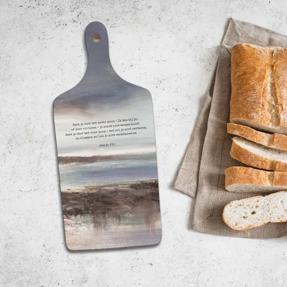 Deze massief houten broodplank is versierd met een serene afbeelding van een waterlandschap en de tekst uit Jesaja 43:2, die herinnert aan Gods voortdurende aanwezigheid.