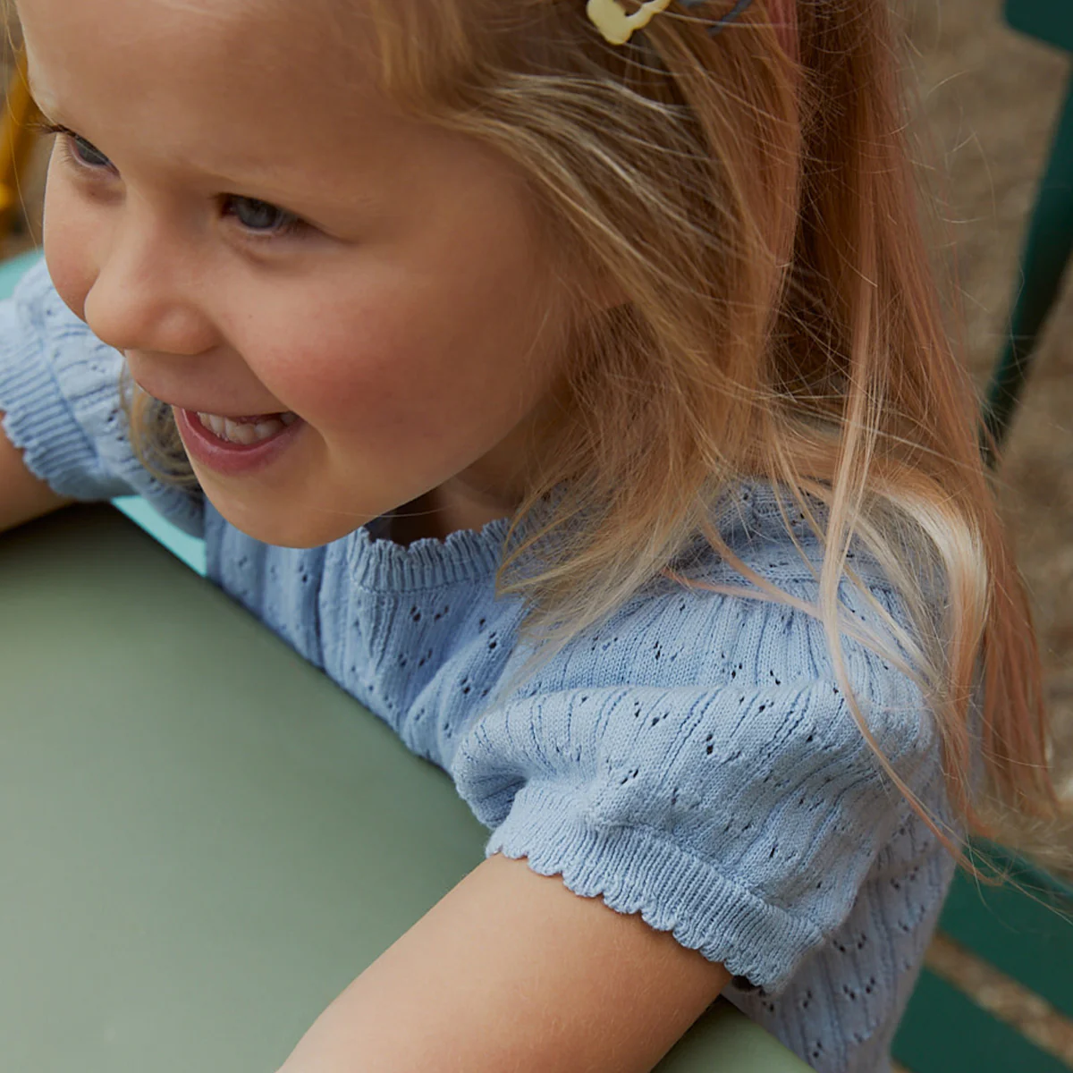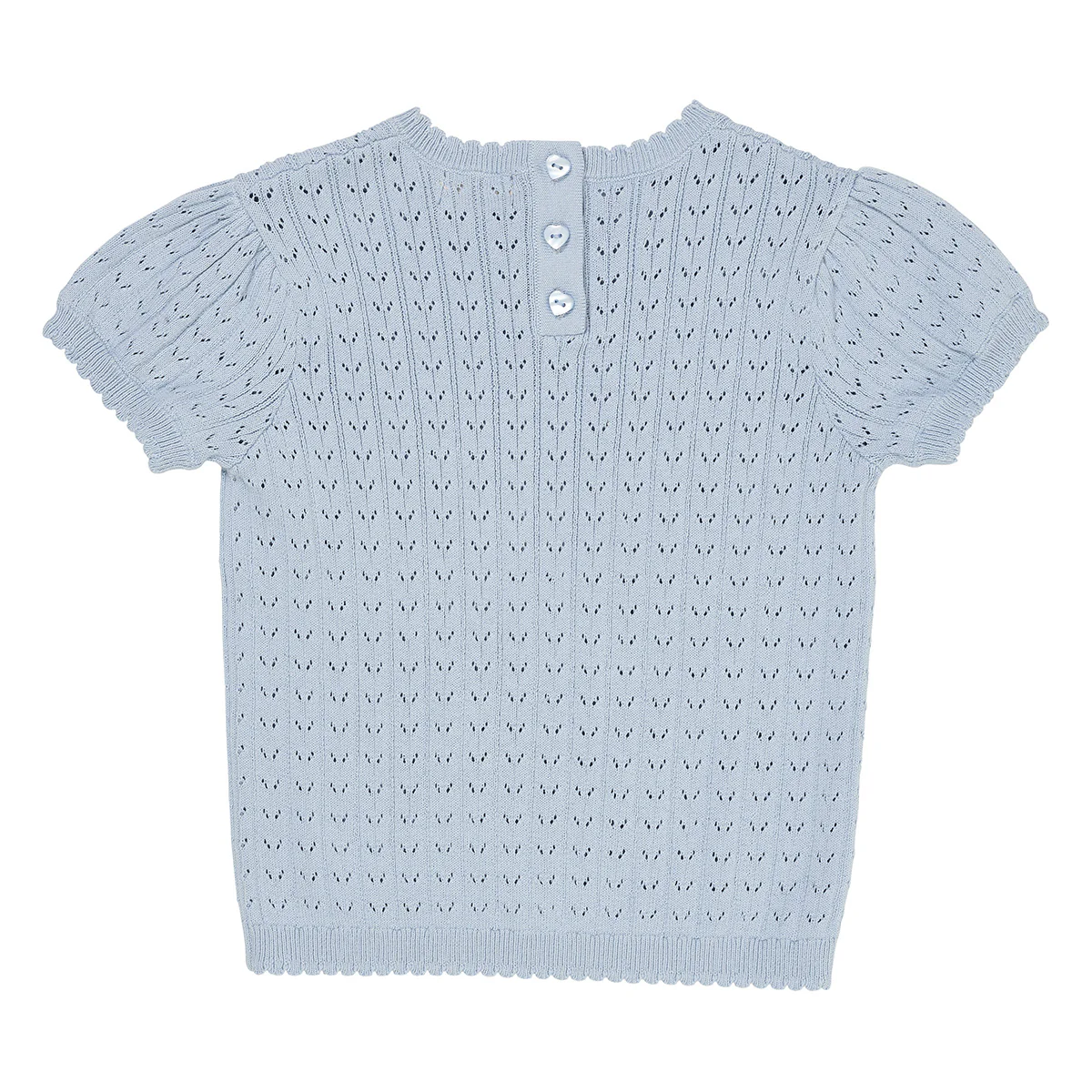 De gebreide pointelle blouse is een charmante toevoeging aan de garderobe van uw kind, waarbij delicate gebreide pointelle-details worden gecombineerd met zachte, ademende stof.
