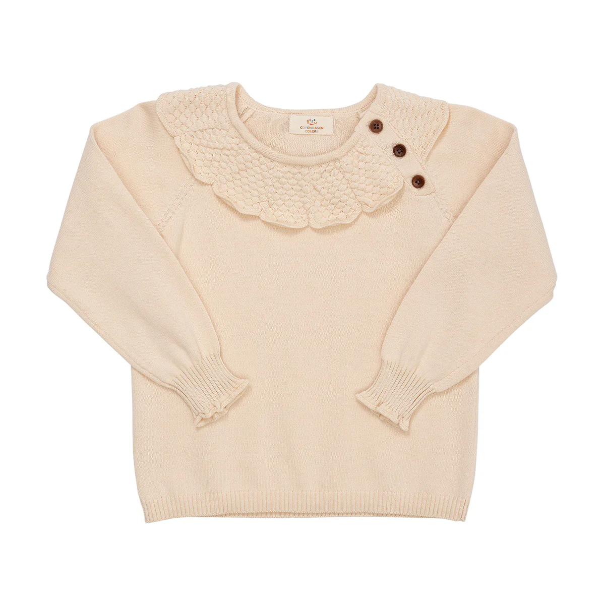 Laat je betoveren door de elegant gebreide truitje van Copenhagen Colors, een waar symbool van verfijning. De trui heeft een tijdloze crème kleur. De charmante kraag, gevormd als een madeliefje, voegt een subtiele gratie toe aan het ontwerp. De drie duurzame corozo knopen en de delicate ruches op de manchetten zorgen voor verfijnde details, waardoor het truitje een tijdloze elegantie uitstraalt. Deze schattige top voor meisjes is dun gebreid. Tijdens de koude winterdagen heb je waarschijnlijk een extra laagje met lange mouwen eronder nodig. Voor de lente en de herfst is margueritte blouse cream van Copenhagen Colors prima zo te dragen.