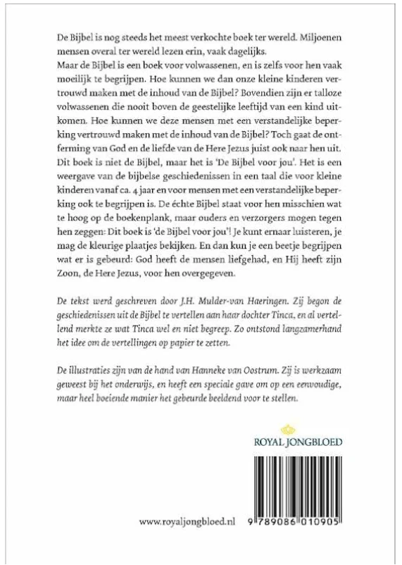 De Bijbel voor jou is geschreven in een aansprekende en eigentijdse taal, zodat kinderen vanaf 4 jaar of met een verstandelijke beperking de bijbel ook kunnen begrijpen. Je voelt een liefdevolle sfeer door de manier van schrijven. De verhalen zijn allemaal 2 à 3 pagina’s lang en staan zo dicht mogelijk bij de originele bijbelverhalen. De illustraties zijn eenvoudig, maar geven net dat beetje extra waardoor kinderen zich meer kunnen inleven in het verhaal.