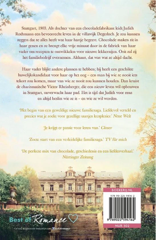 Stuttgart, 1903. Als dochter van een chocoladefabrikant leidt Judith Rothmann een bevoorrecht leven in de villawijk Degerloch. Je zou kunnen zeggen dat ze alles heeft wat haar hartje begeert. Chocolade maken zit in haar genen en ze brengt elke vrije minuut door in de fabriek van haar vader om recepten te ontwikkelen voor nieuwe lekkernijen. Ooit zal zij het familiebedrijf overnemen. Althans, dat was wat ze altijd dacht.