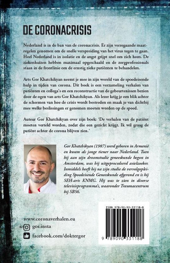 Arts Gor Khatchikyan neemt je mee in zijn wereld van de spoedeisende hulp in tijden van corona. Dit boek is een verzameling verhalen van patiënten en collega’s en een reconstructie van de gebeurtenissen bezien door de ogen van arts Gor Khatchikyan. Als lezer krijg je een blik achter de schermen van hoe de crisis wordt bestreden en maak je van dichtbij mee welke beslissingen er genomen moeten worden op de spoed.