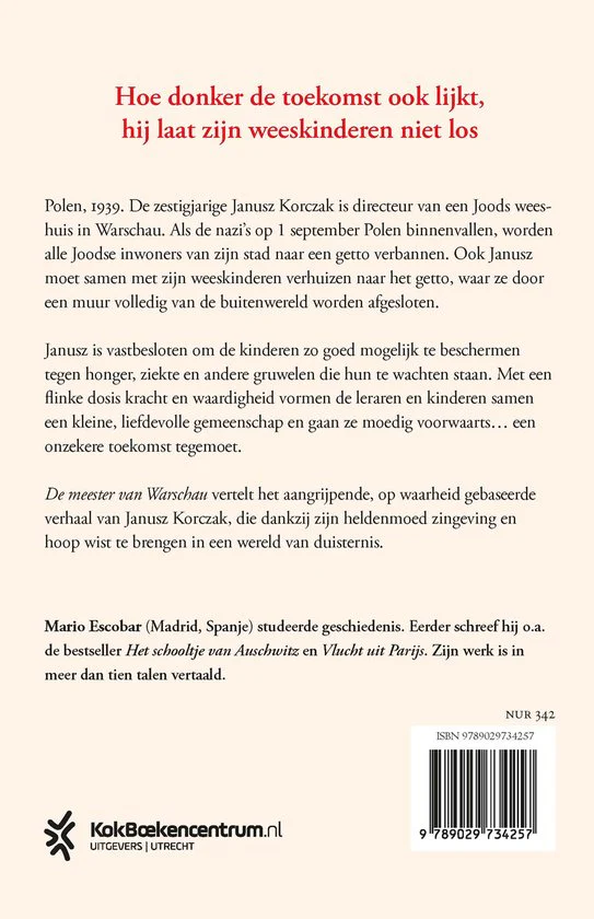 ‘De meester van Warschau’ van Mario Escobar speelt zich af in de Tweede Wereldoorlog in Warschau. Janusz Korczak is de directeur van een Joods weeshuis als de nazi’s op 1 september 1939 Polen binnenvallen. Meer dan vierhonderdduizend Joden, waaronder de kinderen uit het weeshuis, worden opgepakt en gedwongen om in het getto te gaan wonen. Janusz en zijn vrienden zetten alles op alles om de kinderen te beschermen tegen ziekte en honger. Zo creëert Janus met de andere medewerkers en inwoners van het weeshuis een baken van hoop in donkere tijden.