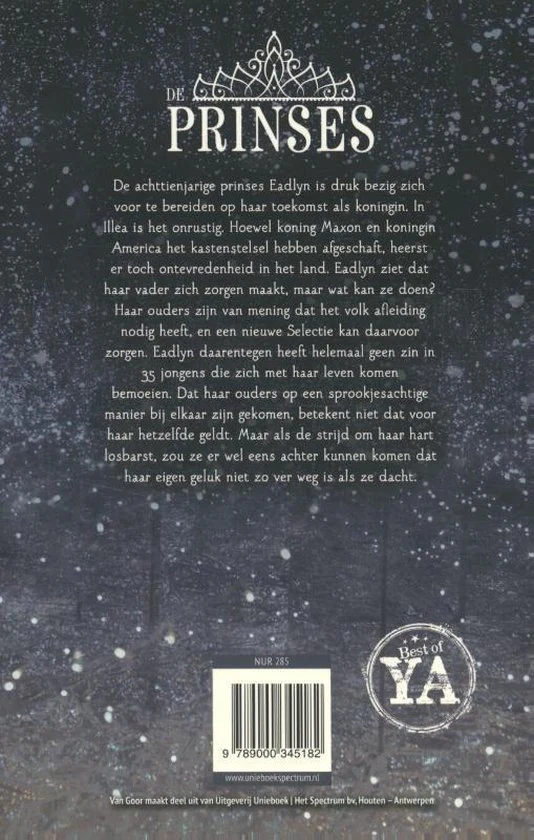 Na het enorme succes van De selectie, De elite en De one schreef bestsellerauteur Kiera Cass dit spannende vervolgverhaal. Twintig jaar geleden deed America Singer mee aan de Selectie en wist ze prins Maxons hart te veroveren. Nu is het de beurt aan prinses Eadlyn om haar eigen Selectie te houden. Eadlyn verwacht niet dat het voor haar even sprookjesachtig zal zijn als het liefdesverhaal van haar ouders. Maar als de strijd om haar hart losbarst, zou ze er wel eens achter kunnen komen dat haar eigen geluk niet zo ver weg is als ze altijd dacht.