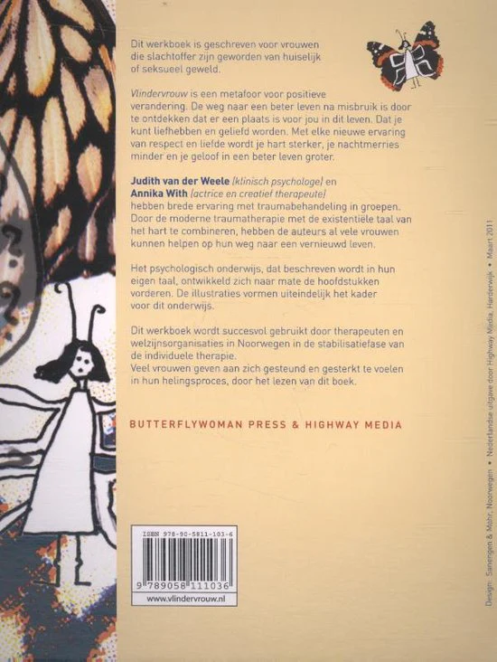 Voor vrouwen voor wie het leven zwaar valt Vlindervrouw is een metafoor voor positieve verandering. De weg naar een beter leven na misbruik is door te ontdekken dat er een plaats is voor jou in dit leven. Dat je kunt liefhebben en geliefd worden. Met elke nieuwe ervaring van respect en liefde word je hart sterker, de nachtmerries minder en je geloof in een beter leven groter. Dit boek behandeld onderwerpen als: * reacties op geweld (ben ik gek, stom of een slecht persoon) * hoe kan ik de manier veranderen zoals ik tegen mezelf praat * grenzen stellen in wat je wilt en niet wilt * hoe kan ik me makkelijker ontspannen * angst en paniekaanvallen; hoe ga ik ermee om * slapeloosheid, nachtmerries * ik vertrouw niemand meer De schrijfsters, Judith van der Weele (NL) en Annika With (Nor), zijn beide al jarenlang werkzaam in Noorwegen en hebben daar een grote bekendheid opgebouwd in hun hulp aan vrouwen, die te maken hebben gehad met geweld, misbruik en andere traumatische ervaringen. Wil van der Weele is een bekend kunstenares die garant staat voor een aantal prachtige kleurrijke kunstwerken in dit boek.