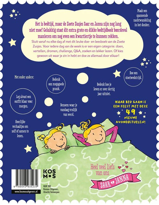 Het allereerste bedtijdboek van De Zoete Zusjes is een gezellig doe- én leesboek bomvol leuke avondrituelen om de dag mee af te sluiten voor het slapengaan.