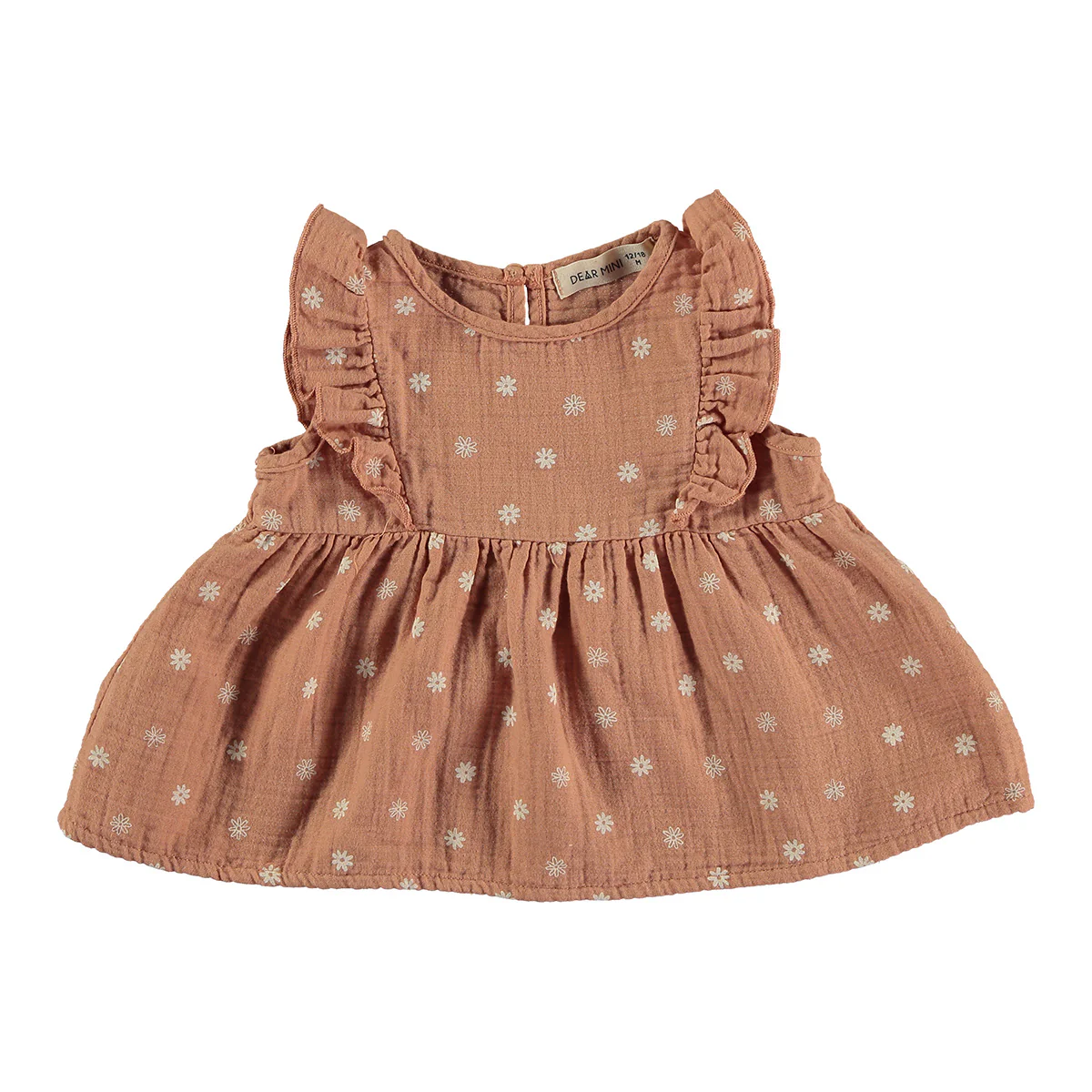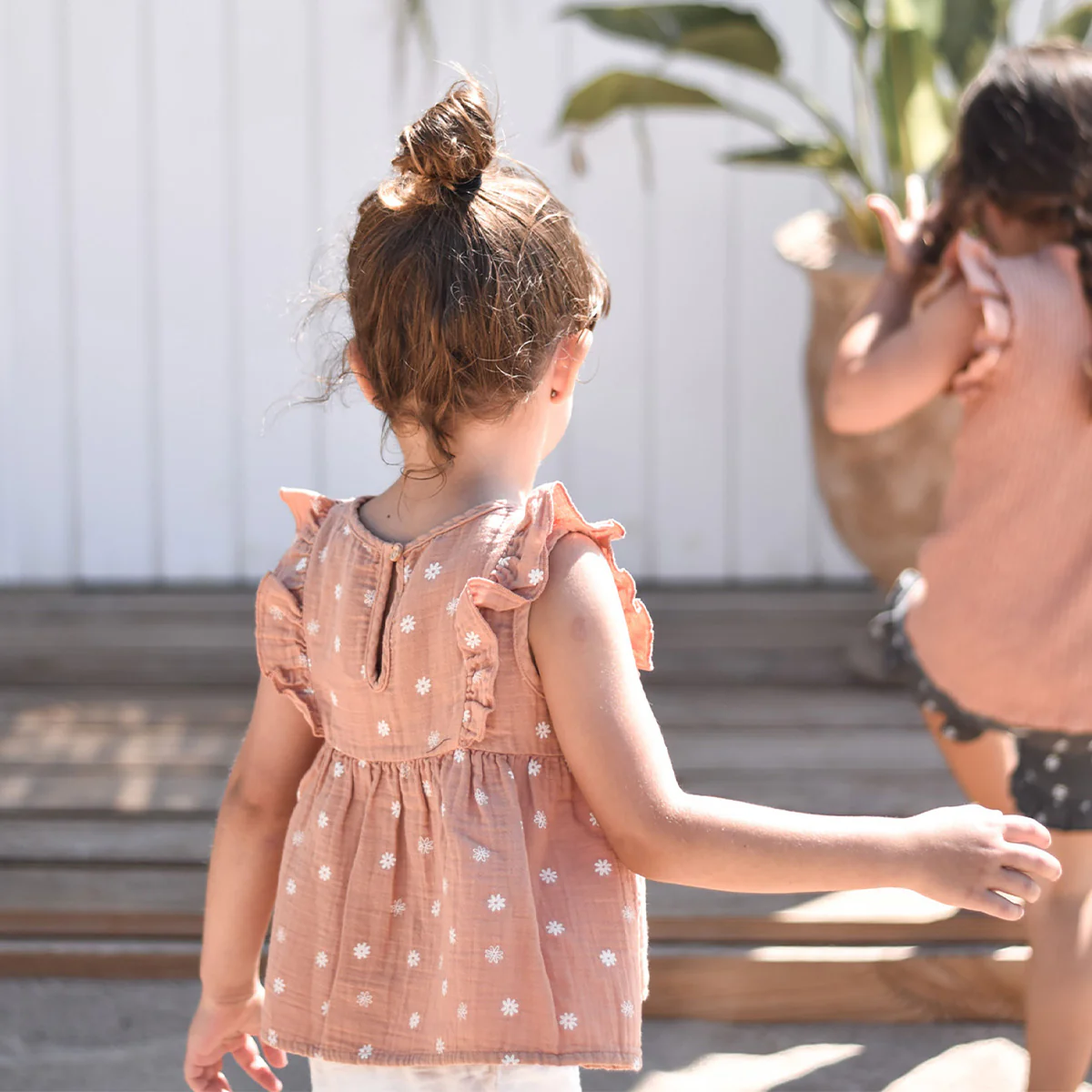 Gebloemde, mouwloze blouse gemaakt van zacht, luchtig en biologisch katoen. Heerlijk voor de warme zomerdagen. Het tuniek heeft een babydoll model, een all-over print van madeliefjes, ruches bij de schouders en een knoopsluiting aan de achterkant. De kleur is terracotta/salmon. Mooi te combineren met de andere items uit de Endless Summer Collectie van Dear Mini, zoals de zomerse shorts voor meisjes.