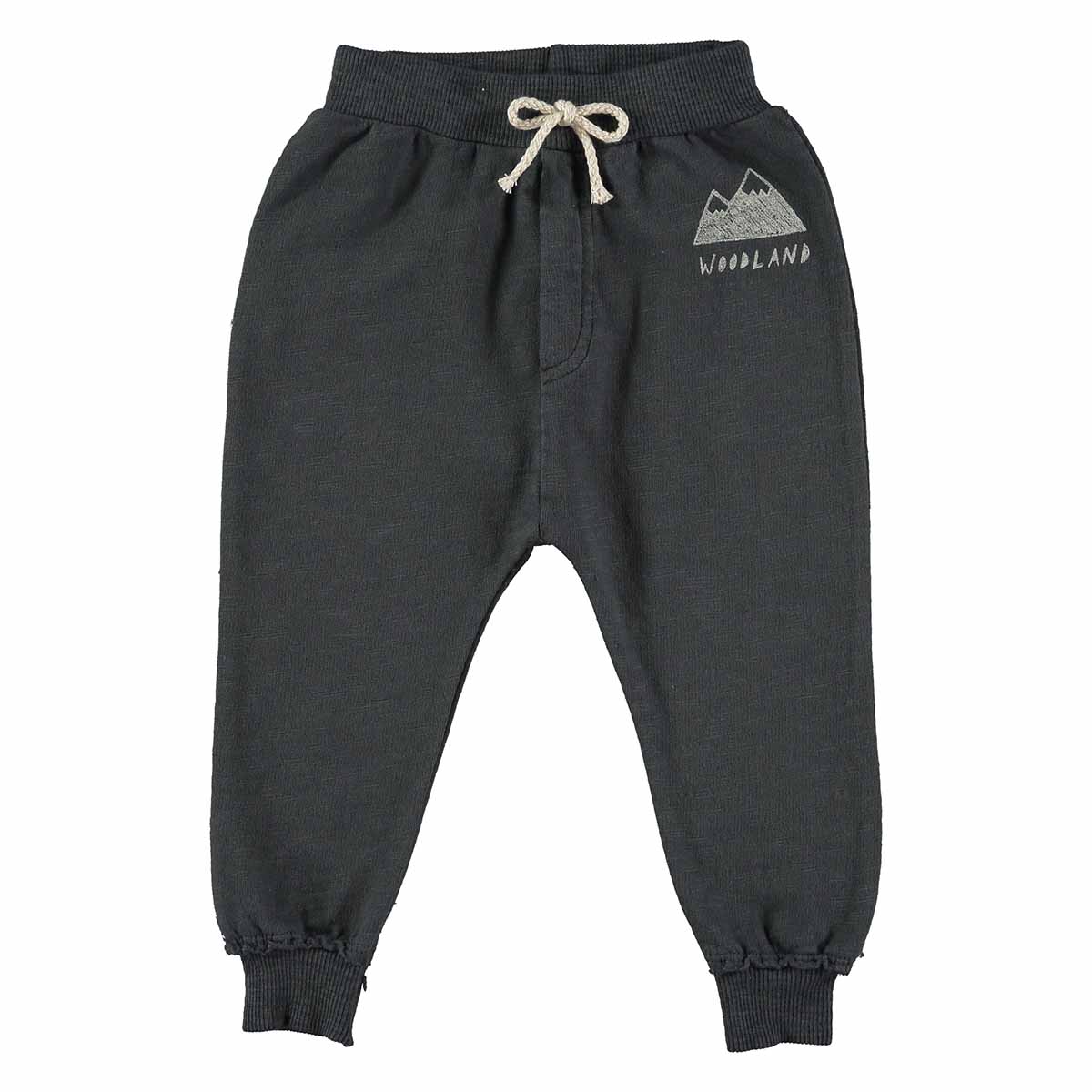 Jogging broekje met witte details (trekkoord en opdruk). Pants Pyrenees heeft een klein printje links met, je raad het al, bergen. Onder het printje staat de tekst ‘woodlands’. De kleur van deze jogging heet shadow gray. Deze kleur kan het best beschreven als een donkergrijze tint met blauwige gloed. Zeker in bepaald licht lijkt de jogging net marineblauw.