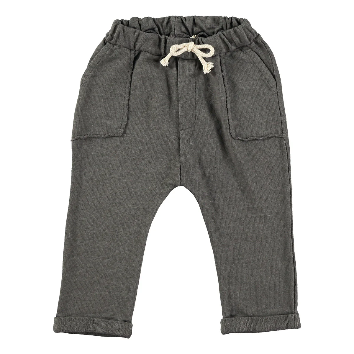 Pocket pants in een antraciet kleur. Zitten heerlijk zacht en zijn gemaakt van biologisch katoen. Deze pocket pants zijn perfect voor het voor- en najaar. De broek heeft elastische taille en steekzakken.