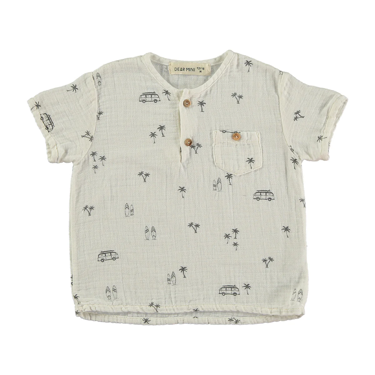Zomers shirt met korte mouwen, gemaakt van zacht, luchtig en biologisch katoen. In een neutrale offwhite kleur met een fantastische all over print met palmbomen, surfplanken en kampeerbussen. Tropical vibes! Perfect voor de warme zomerdagen. Het shirt heeft een mooie afwerking met houten knoopjes in de hals en een borstzakje links met knoopsluiting. Shirt palms offwhite is goed te combineren met de andere items uit de Endless Summer Collectie van Dear Mini.