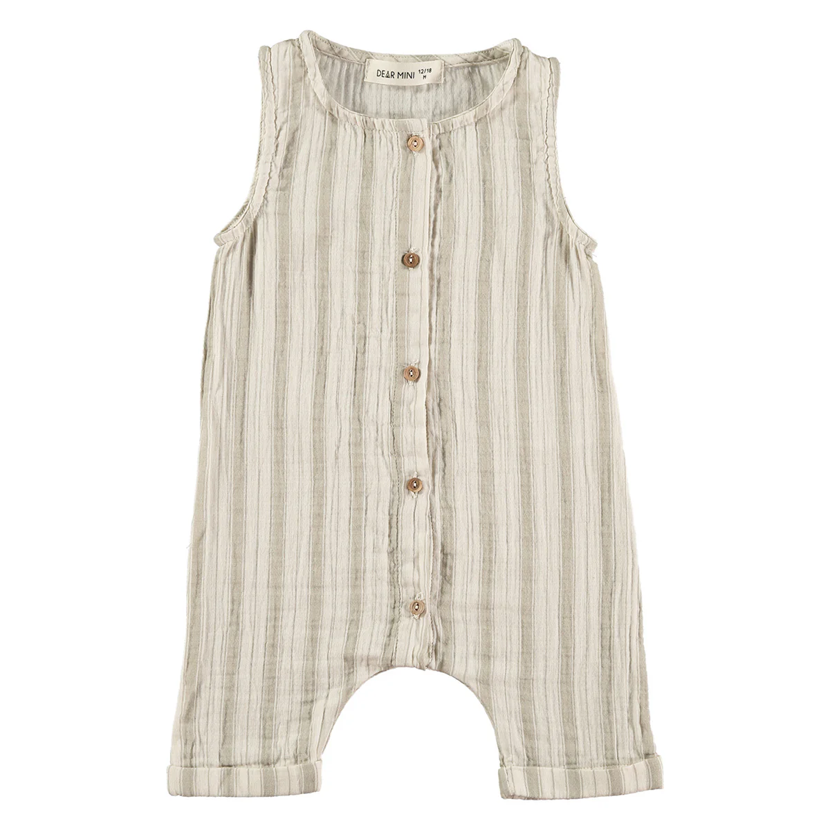 Zomerse jumpsuit met korte mouwen en korte broekspijpen in een rustiek streep patroon. Deze gestreepte jumpsuit heeft houten knopen aan de voorkant. De strepen hebben de kleuren beige/offwhite. Ideaal en luchtig kledingstuk voor de hete zomerdagen!