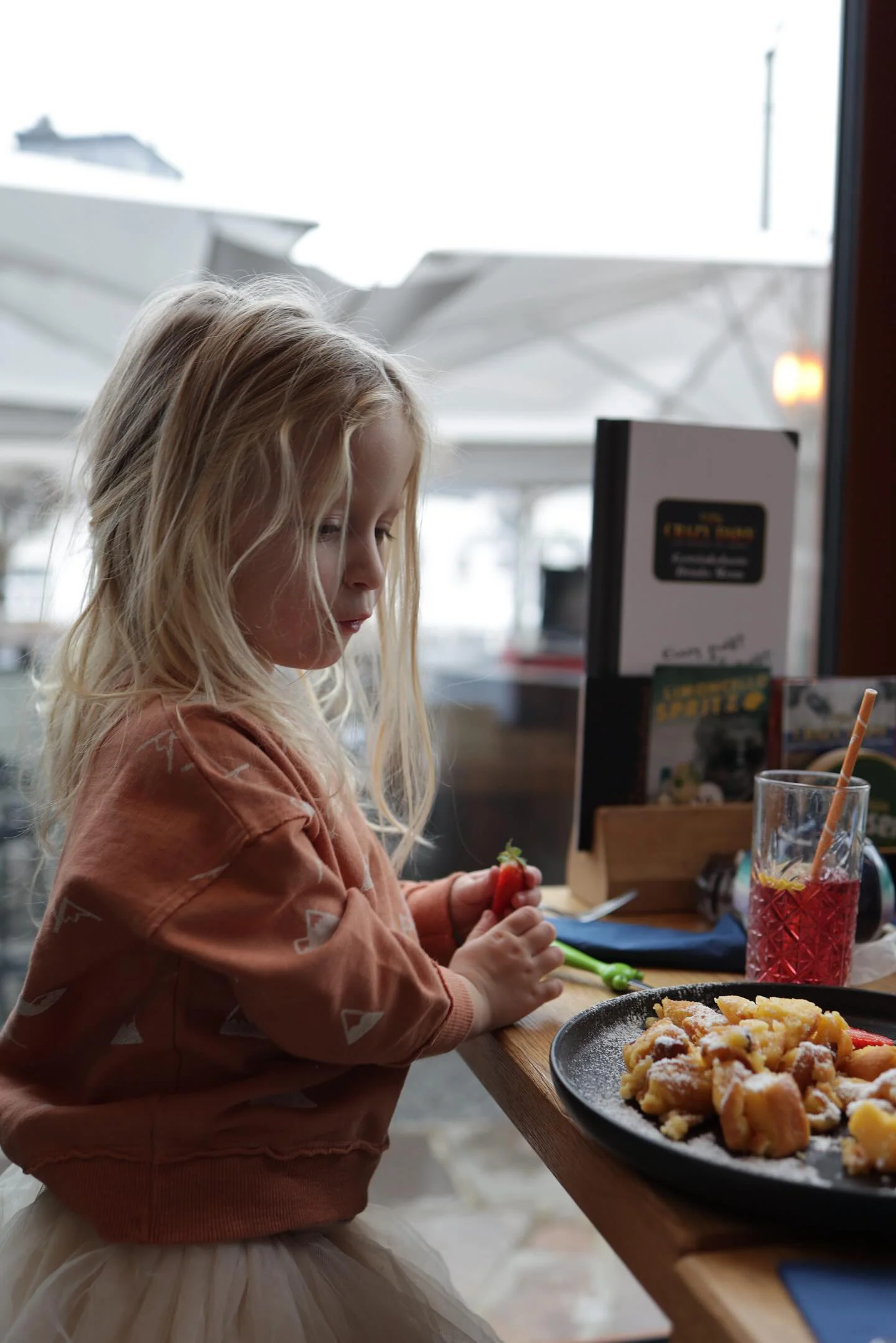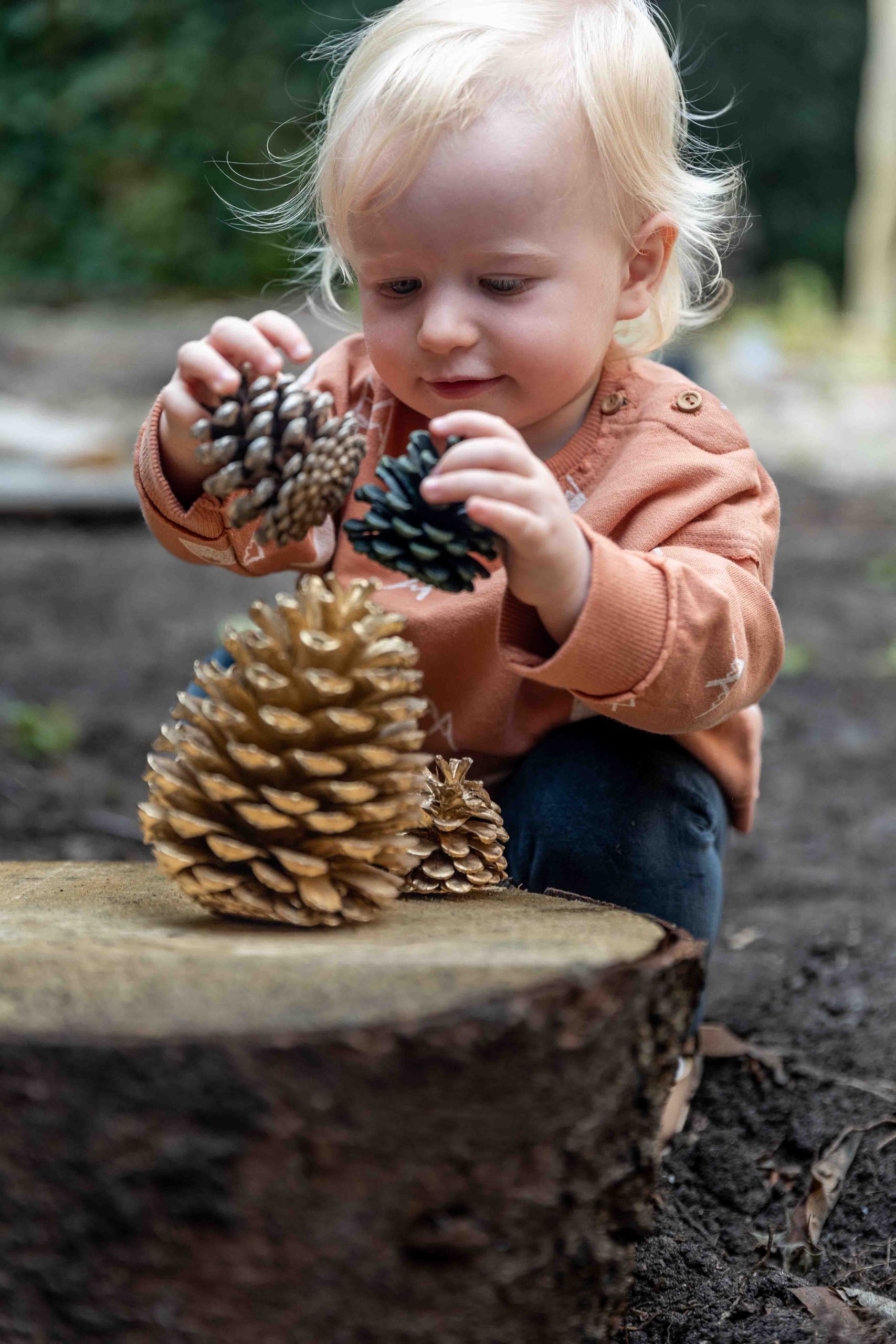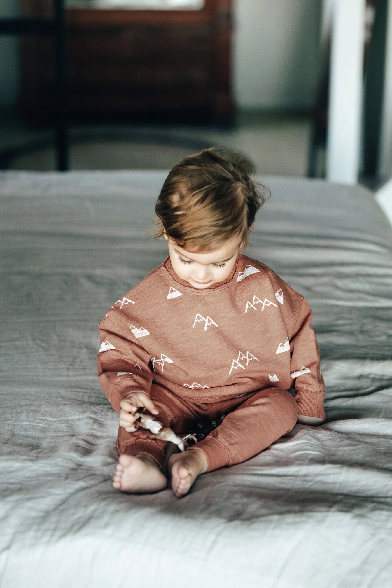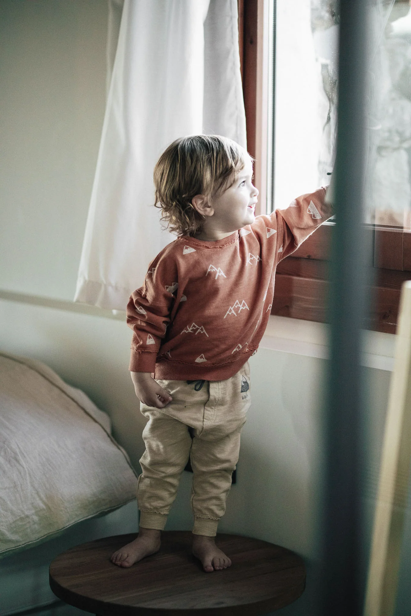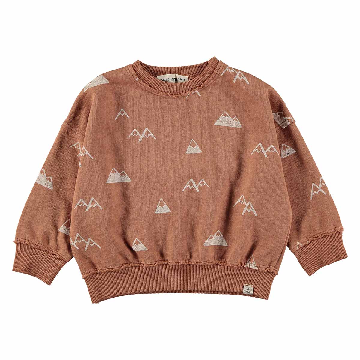 Sweater met bergen, de alpen. De kleur heet ‘clay’ en is het best te beschrijven als perzik/zalm kleur. Sweater Alps heeft in de kleine maten (62/68 en 74/80) twee houten knoopjes bij de halsopening, bij de grotere maten zijn deze knoopjes er niet.