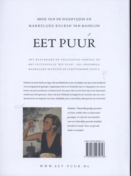 HET NIEUWE KOKEN: PUUR, GEZOND EN TIJDLOOS. HET KLEURRIJKE EN VEELZIJDIGE VERVOLG OP HET SUCCESVOLLE KOOKBOEK ‘EET PUUR’. VOL ORIGINELE, MAKKELIJKE RECEPTEN EN SCHITTERENDE FOTO’S. Madelon de Joode heeft een eigen stijl van koken ontwikkeld die na het verschijnen van haar eerste kookboek veel navolging heeft gekregen. Regelmatig werkt ze in Frankrijk waar ze volop geniet van wat de natuur aan pure producten te bieden heeft. Maar ook haar Hollandse boomgaard en moestuin zijn een voortdurende bron van inspiratie voor haar. De pure ingrediënten, samengebracht in mooie en verrassende smaakcombinaties maken dat een gerecht uit dit boek niets extra’s nodig heeft. Een kookboek vol met de lekkerste recepten voor het hele gezin, voor elk moment van de dag. Makkelijk, puur en heel lekker, dáár gaat het om in dit boek! Madelon: ‘Met mijn recepten tover je in een handomdraai de lekkerste gerechten op tafel voor het hele gezin. Ook als je rekening moet houden met intoleranties. Of je af wil vallen, meer energie wil krijgen of gewoon gezonder wil eten, met dit boek zit je goed!’