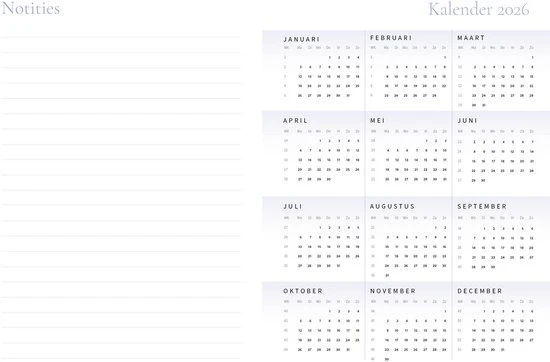 Het weekoverzicht start op maandag en heeft extra ruimte voor notities. In de jaarplanner vind je ook een jaaroverzicht voor 2026 en 2027, net als een overzicht van schoolvakanties en feestdagen.