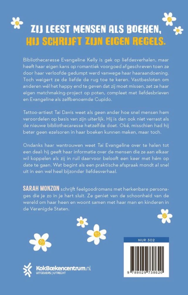 In ‘Ezelsoren en muurbloempjes’ van Sarah Monzon verliest de nieuwe bibliothecaresse Evangeline Kelly zich maar al te graag in een heerlijke romance. Haar eigen liefdesverhaal heeft ze afgeschreven nadat haar verloofde haar heeft gedumpt vanwege haar haaraandoening. Maar dat betekent niet dat ze de liefde volledig de rug toekeert. Integendeel, vastbesloten om iedereen het sprookje te gunnen dat ze zelf heeft moeten opgeven, besluit Evangeline voor koppelaarster te spelen en lezers met elkaar te matchen op basis van de door hen gelezen boeken.