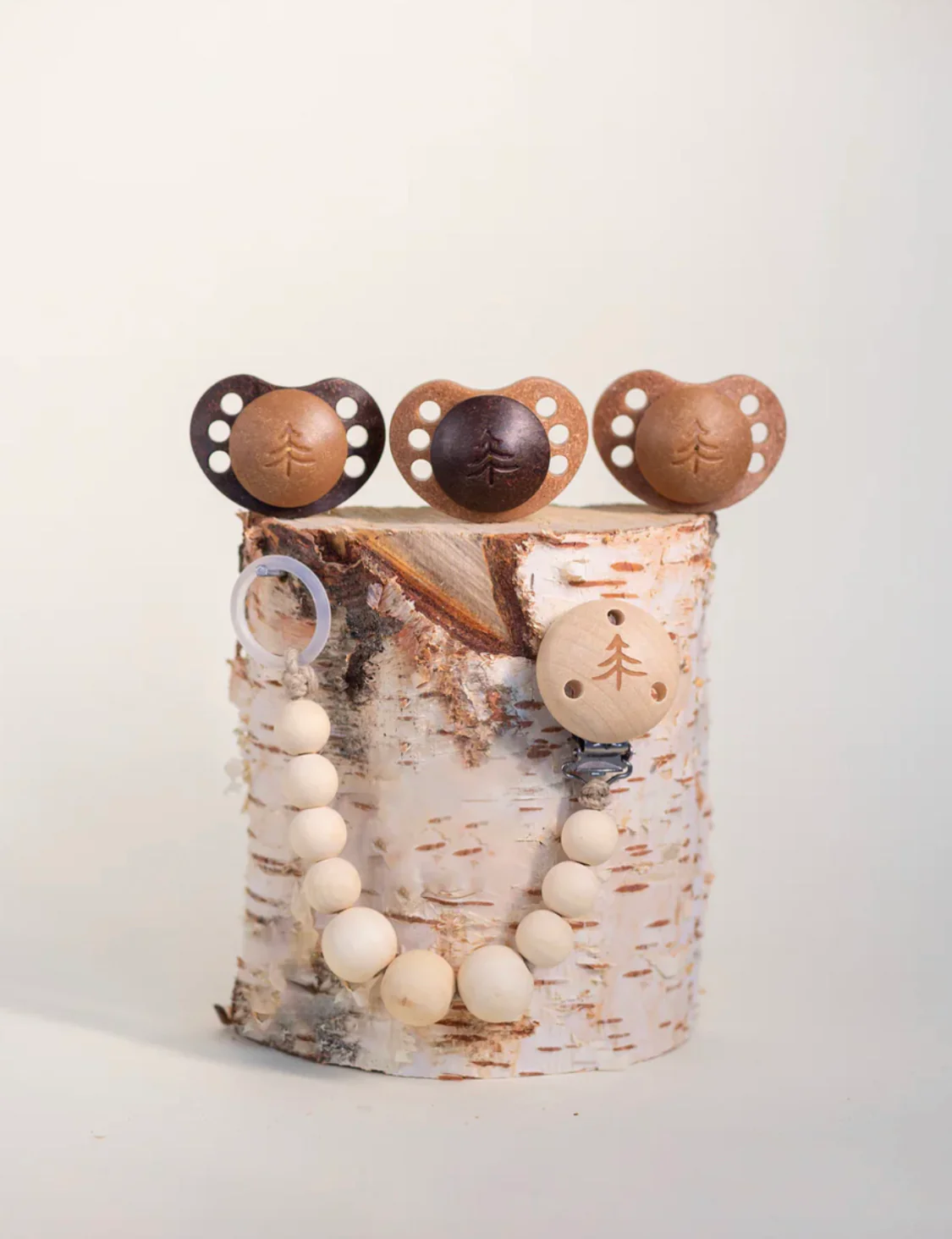 Een leuk cadeautje voor jezelf, voor een zwangere of als kraamcadeau. Dit gift pack bestaat uit drie kleuren platte spenen met de orthodontic/dental speen (de afgeplatte speen) en het speenkoord uit de Skogen Baby collectie.