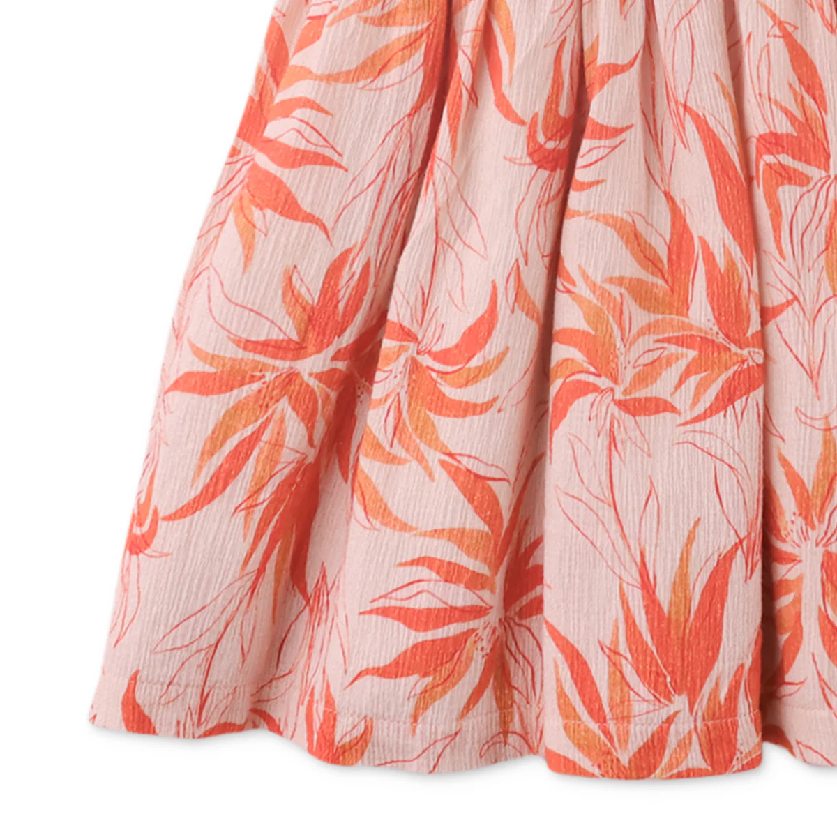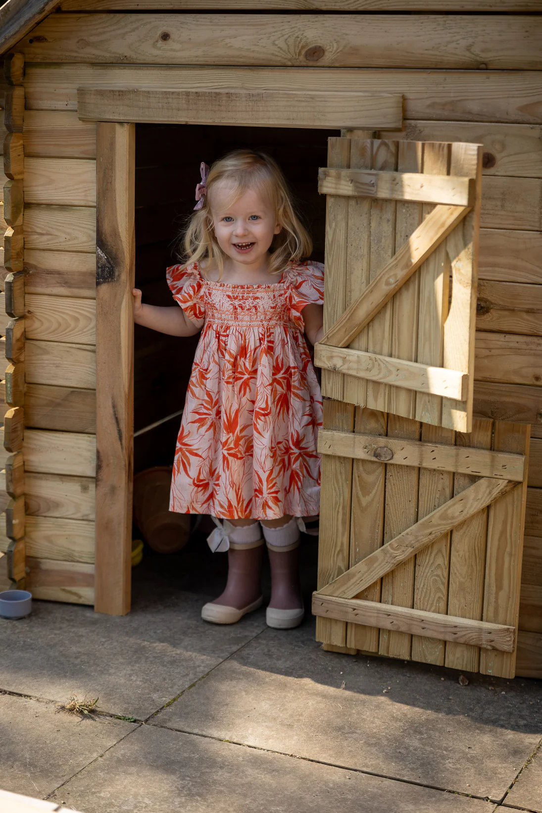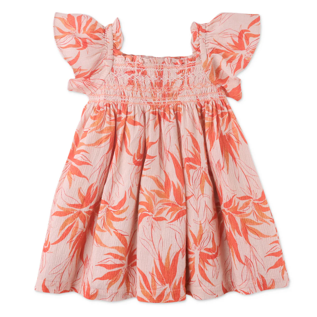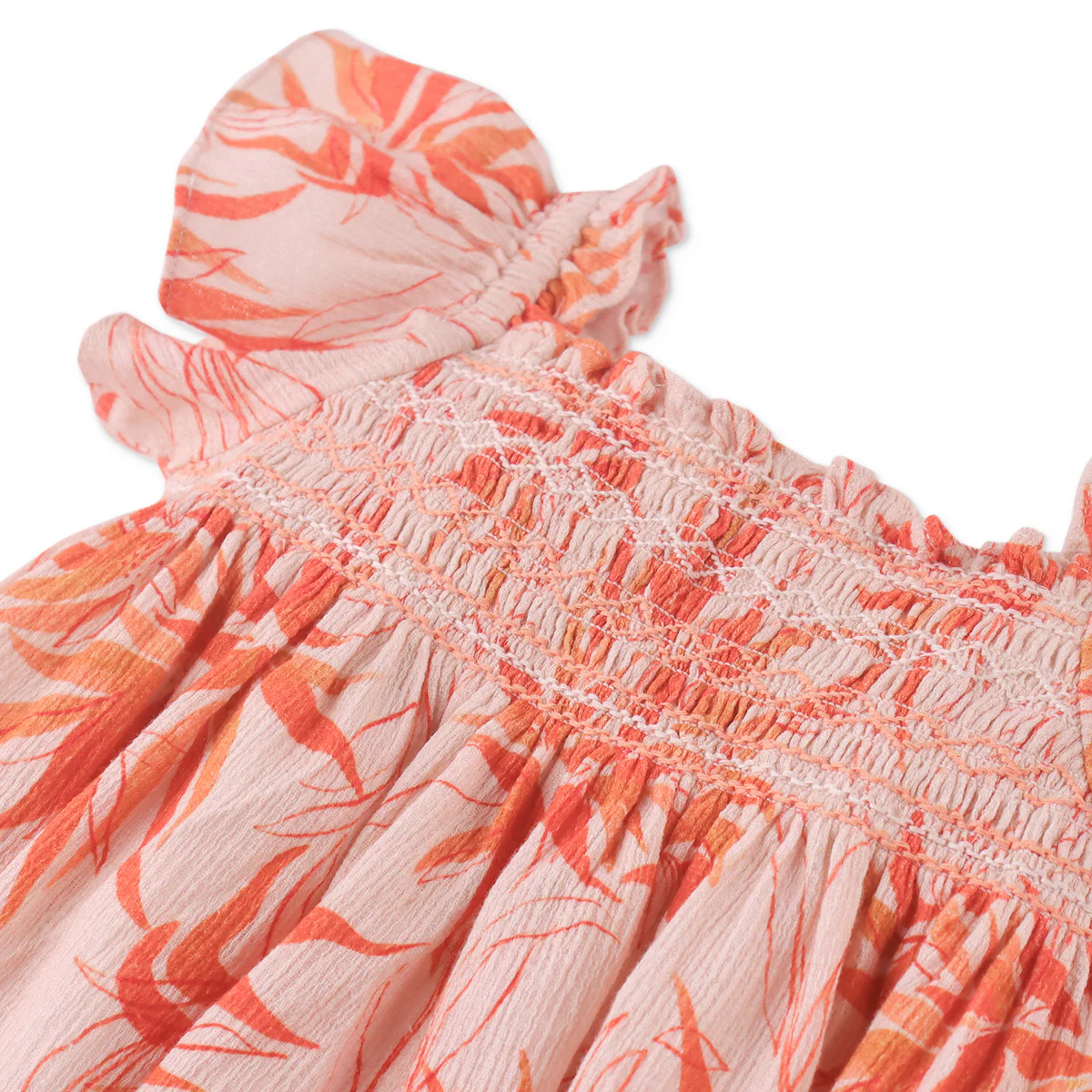 Heerlijke zomerse jurk met honeycomb hals. Perzik roze basiskleur met fel oranje bloemen. Vrolijker wordt het niet, mooier ook niet!